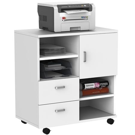 Se trata del mueble auxiliar perfecto para tu oficina o hogar, de diseño sencillo y compacto no ocupa apenas espacio, por lo que es ideal para espacios reducidos. Es perfecto para colocar una impresora encima, ya que se trata de un armario resistente que soporta hasta 25 kg. El espacio de almacenaje disponible está distribuido en varios espacios, alternando compartimentos abiertos con cajones cerrados, por lo que podrás colocar todo lo que necesites tener a mano y documentos u objetos que prefieras mantener ocultos. Se trata de un mueble muy versátil, encajará perfectamente con cualquier ambiente, muy útil tanto para oficina como para diseñar tu propia oficina en el hogar.