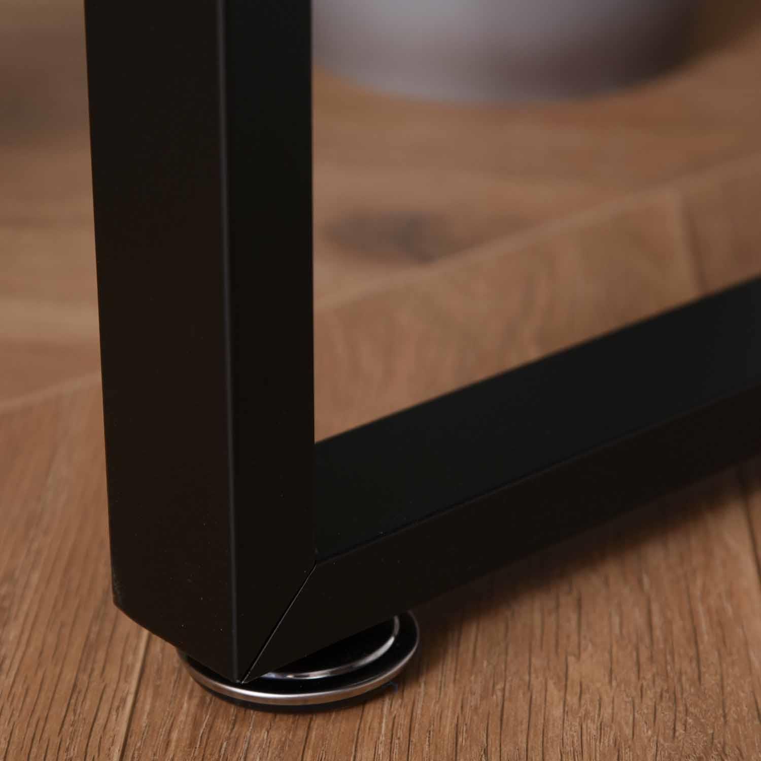 Este escritorio también sobresale por los materiales de primera calidad que se han seleccionado para su fabricación. La superficie de madera de aglomerado es resistente y está recubierta de melamina, un material muy fácil de mantener y limpiar. La estructura metálica que la sostiene proporciona gran robustez y su plancha posterior de rejilla, que a la vez de resultar decorativa, refuerza la estructura de la mesa dándole más estabilidad. Sus patas regulables en altura hacen que la mesa se mantenga estable incluso en suelos irregulares y protegen el suelo de desgaste y rayones.