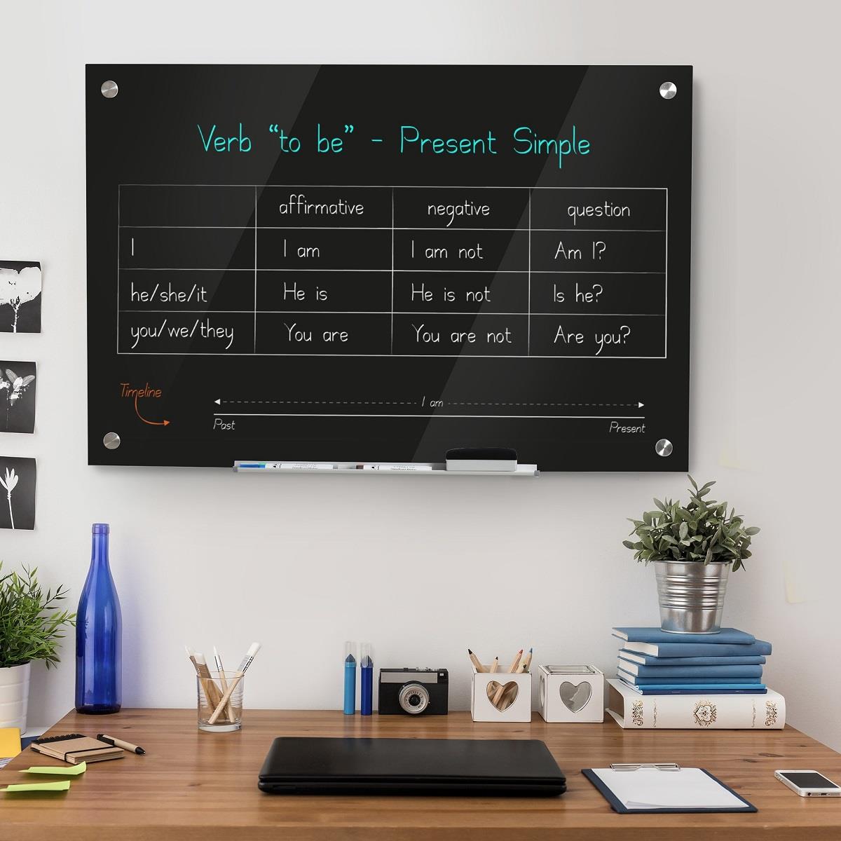 Se trata de una pizarra magnética, puedes añadirle imanes para colocar documentos, láminas o cualquier elemento que necesites tener a mano. Dispone de una bandeja de aleación de aluminio para depositar rotuladores y el borrador (incluyen 4 rotuladores y un borrador, no magnéticos). Para que los rotuladores funcionen por primera vez, es necesario presionar la punta contra una superficie lisa para que la tinta baje. Este mecanismo permite que la tinta no se seque y el rotulador permanezca intacto antes de su primer uso.