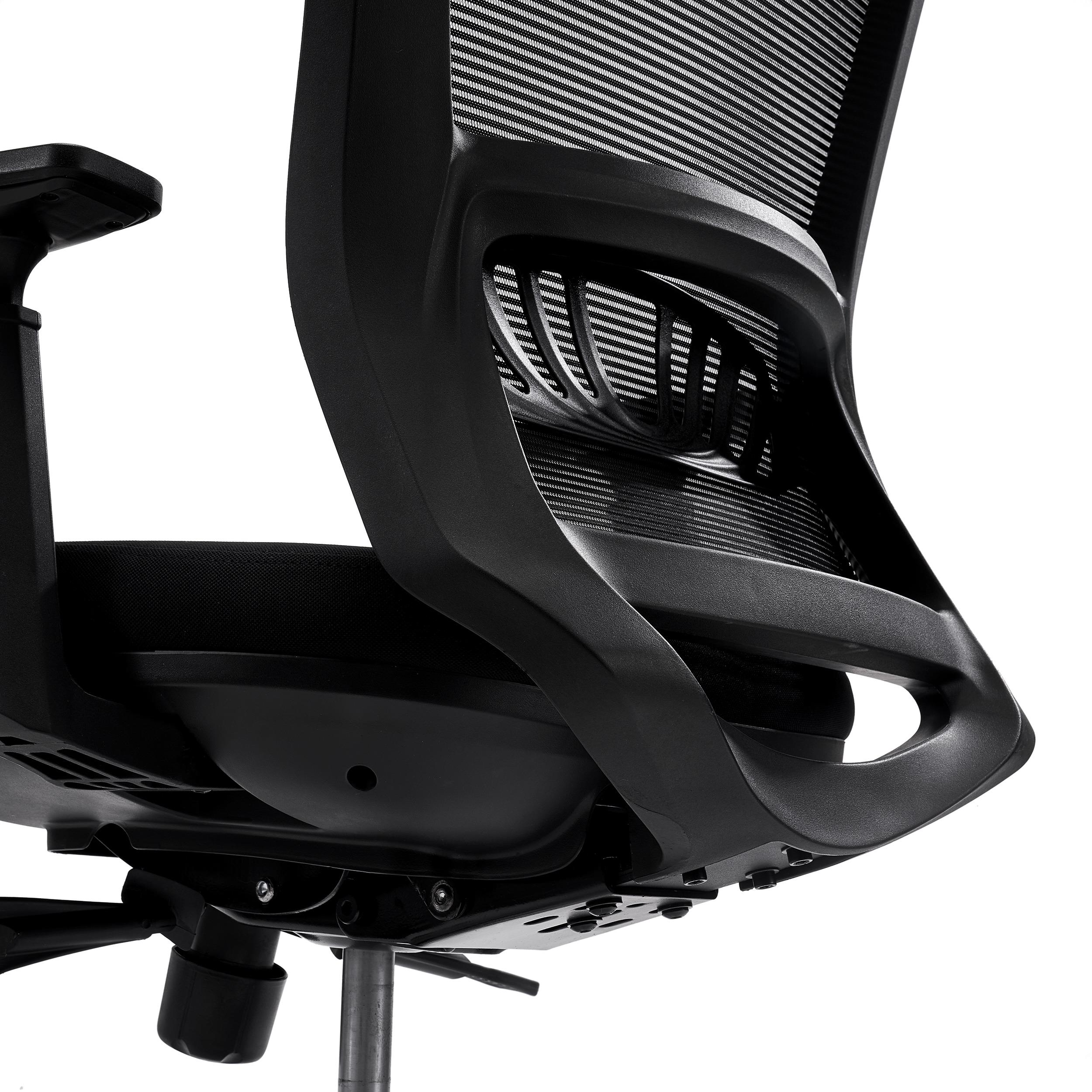 Empezando por la comodidad, destacar el amplio respaldo en malla transpirable, con soporte lumbar ajustable en altura. Tiene una generosa altura y anchura, de modo que cubre bien toda la espalda y hombros. Un modelo recomendable para personas altas que busquen una silla que se adapte bien a su talla.