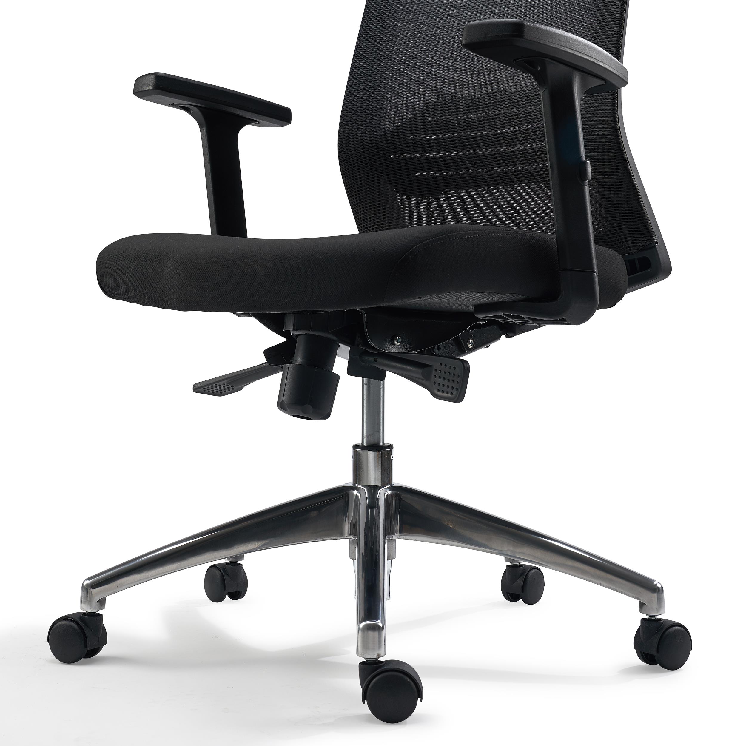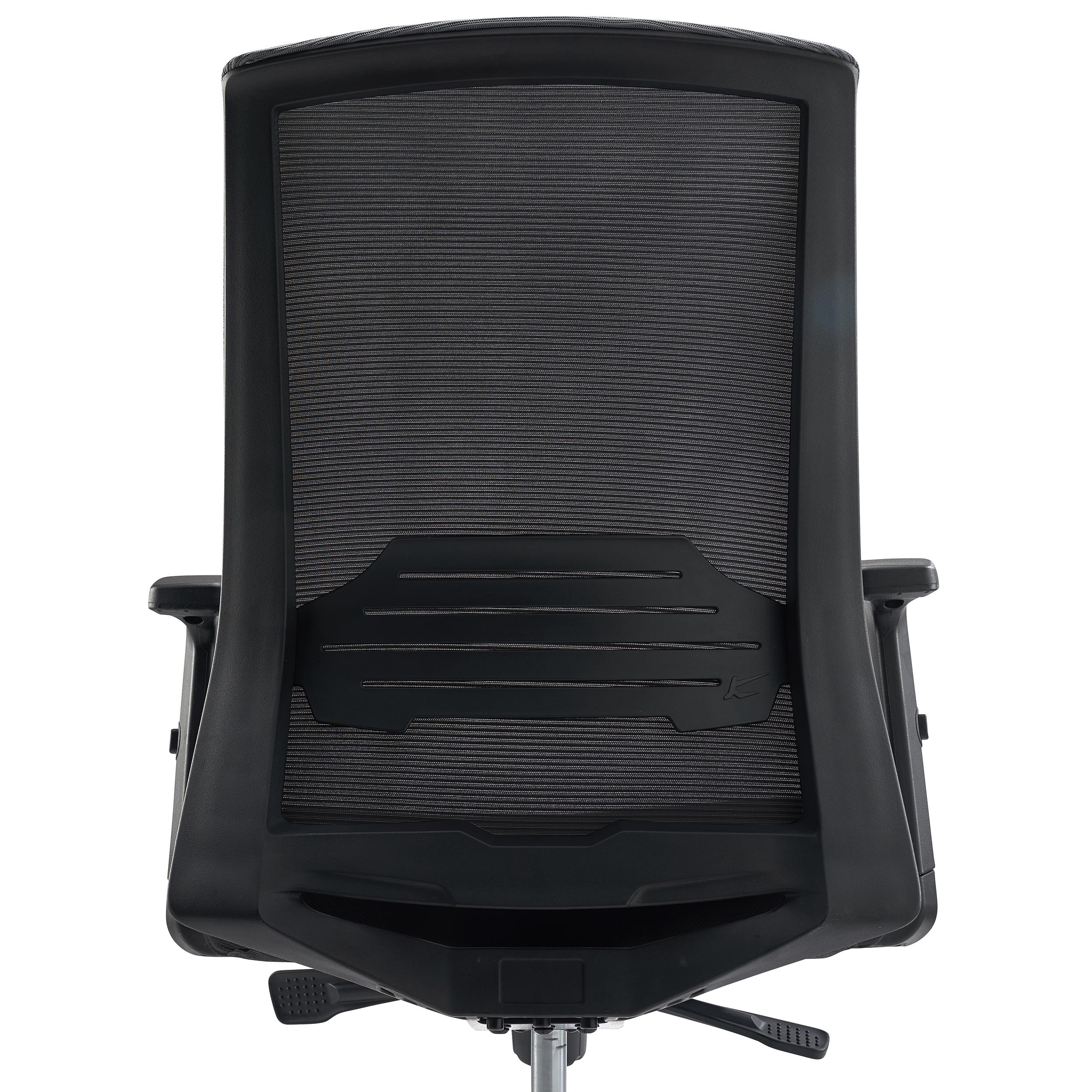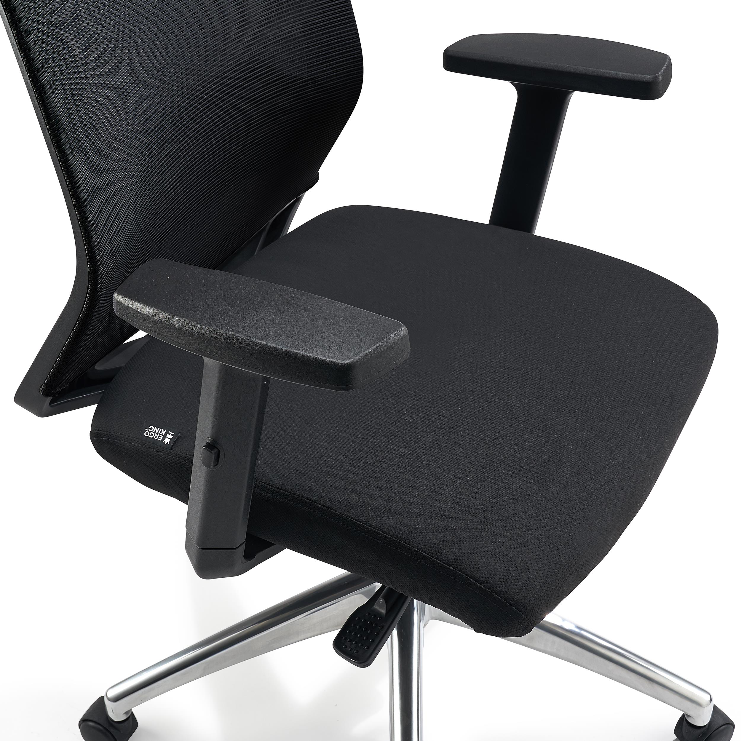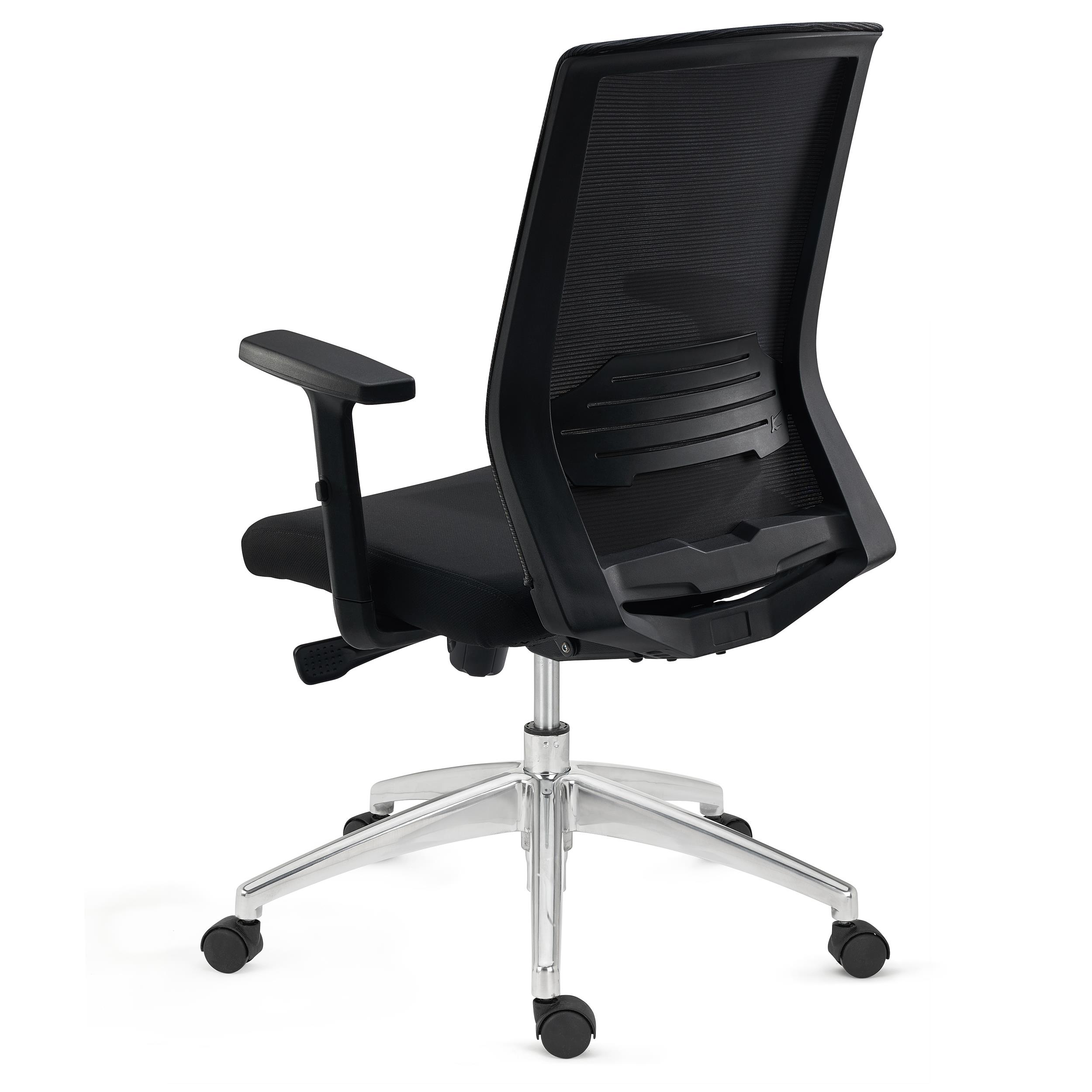 Llama la atención el robusto diseño de su respaldo. Presenta unas sólidas líneas pero que fluyen en una terminación más minimalista, la combinación perfecta para transmitir profesionalidad. El respaldo tiene una altura superior a la habitual en este tipo de sillas (62,5 cm), ideal para cubrir mejor la espalda. Es posible incluso ajustar la profundidad unos milímetros, acercándolo o alejándolo de la espalda.