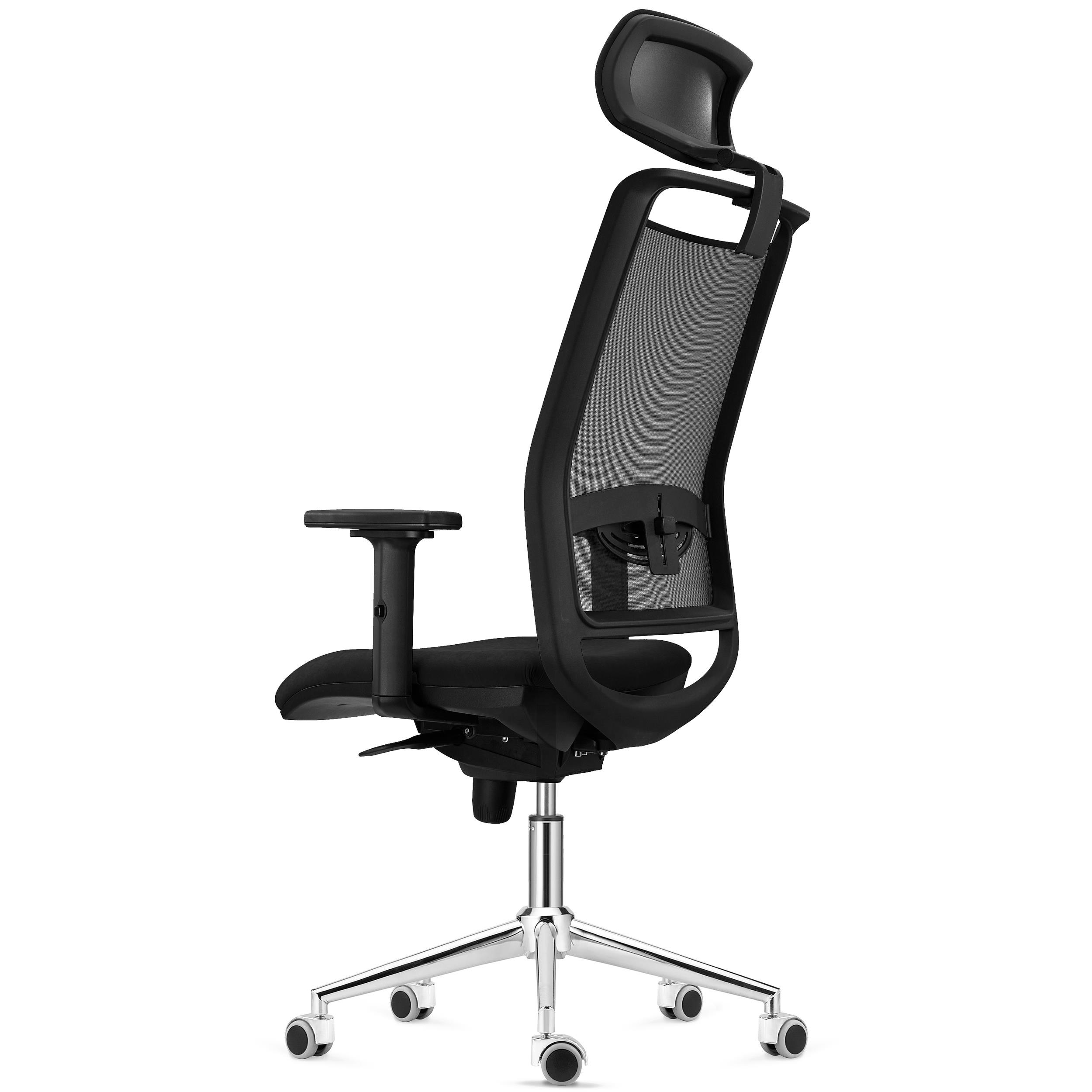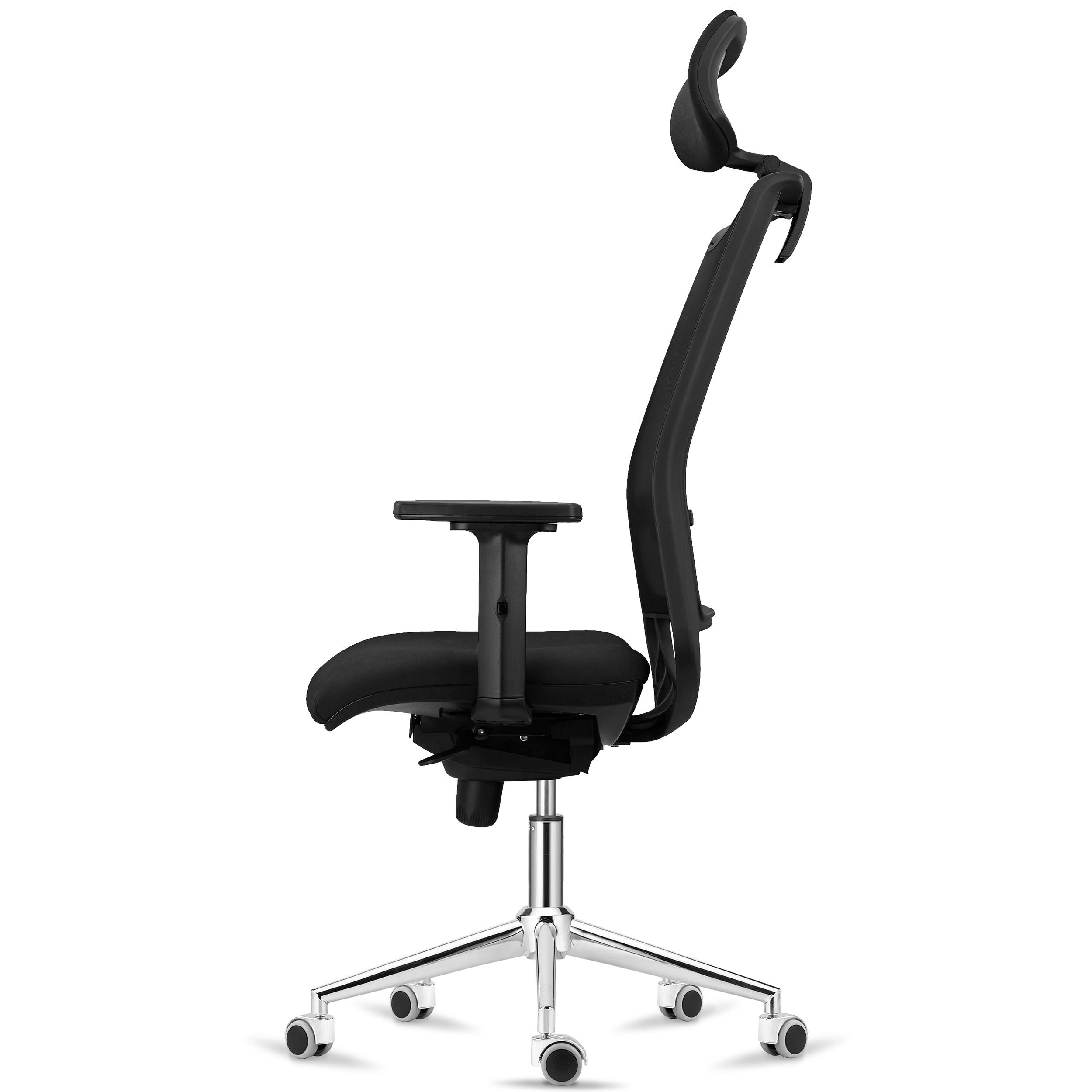 Sobresale también en el campo del confort. Su estudiado diseño ergonómico es uno de los factores clave de esta silla, pues procura que el usuario mantenga en todo momento una postura saludable. El grueso acolchado de alta densidad del asiento (30 kg/m3) y el soporte lumbar ajustable en altura confieren al usuario una alta dosis de confort. Además, sus brazos ajustables en altura ofrecen un buen punto de apoyo y tambíen dispone de reposacabezas tapizado regulable en altura e inclinación.