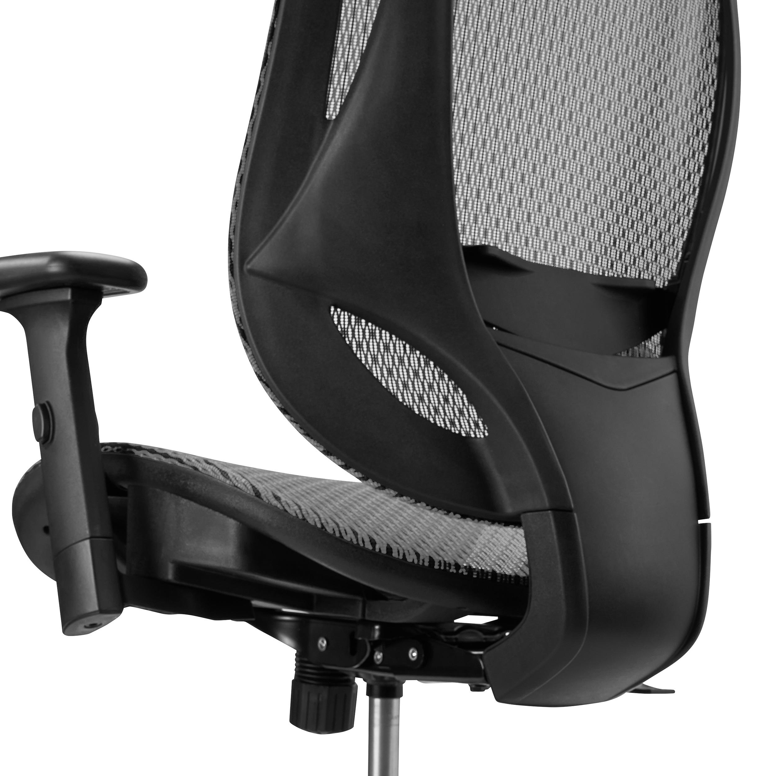 Tiene un avanzado respaldo ergonómico, en malla transpirable y con soporte lumbar ajustable. Está específicamente diseñado para que la espalda mantenga en todo momento una óptima postura. La regulación del soporte lumbar es un aspecto clave e importante para conseguir la mejor adaptabilidad.
