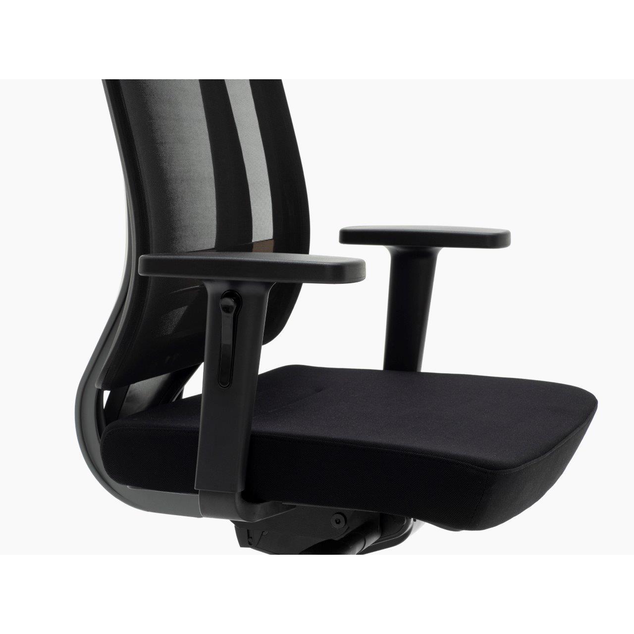 A pesar de parecer fijo, el reposacabezas tiene regulación en altura. Por su parte, los reposabrazos son también ajustables en altura con unas suaves almohadillas de goma para mayor confort. Todas estas regulaciones hacen que la silla esté adaptada para uso intensivo profesional de 8 horas diarias o incluso más.