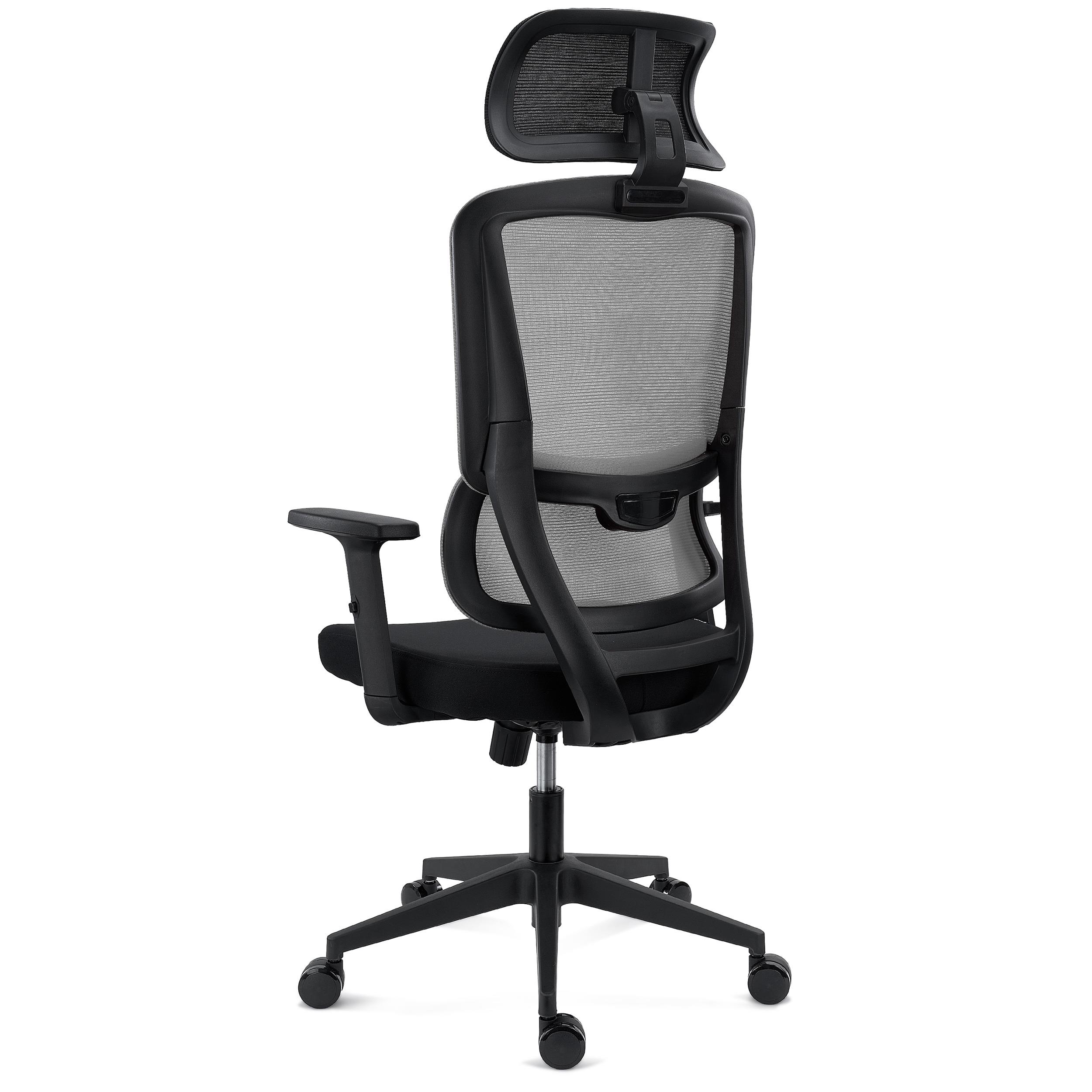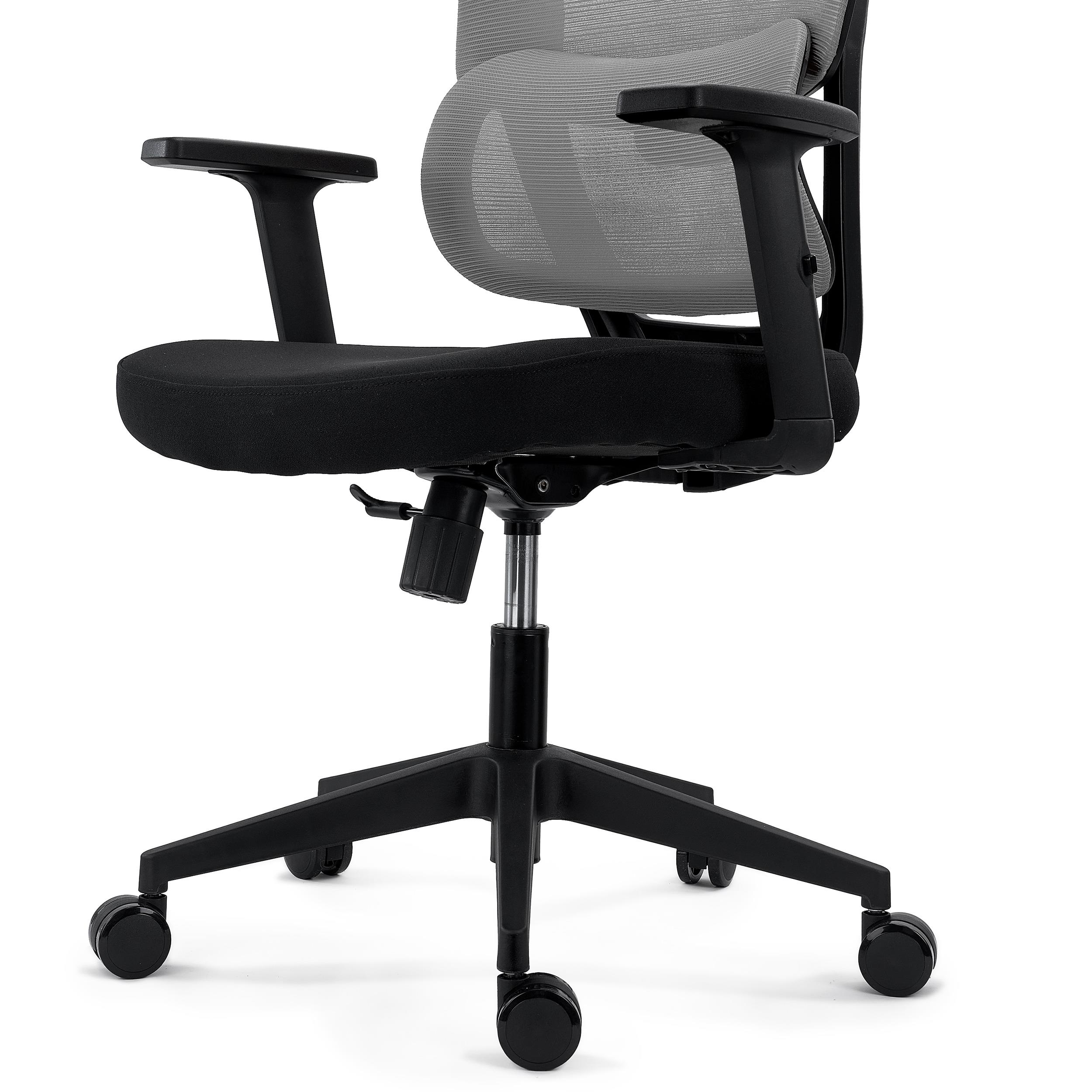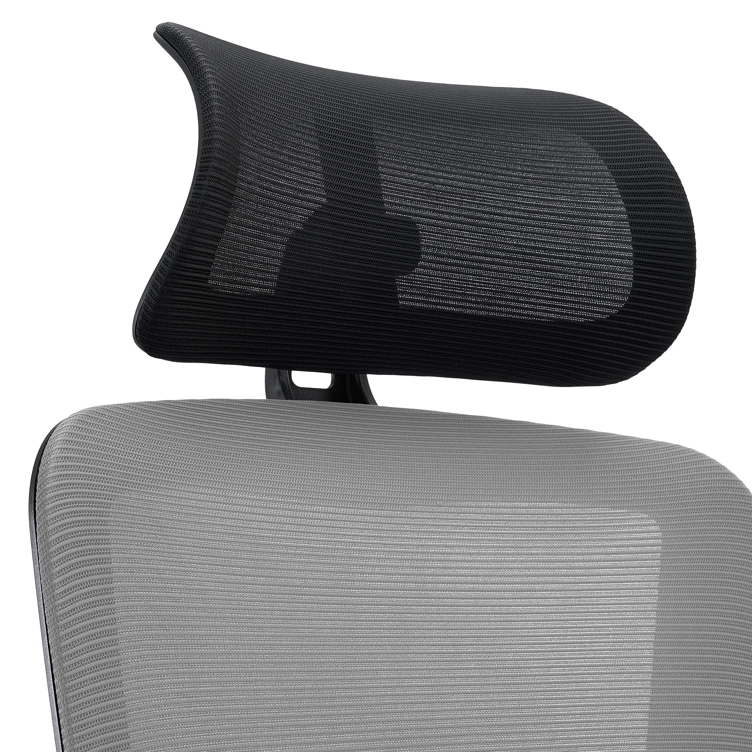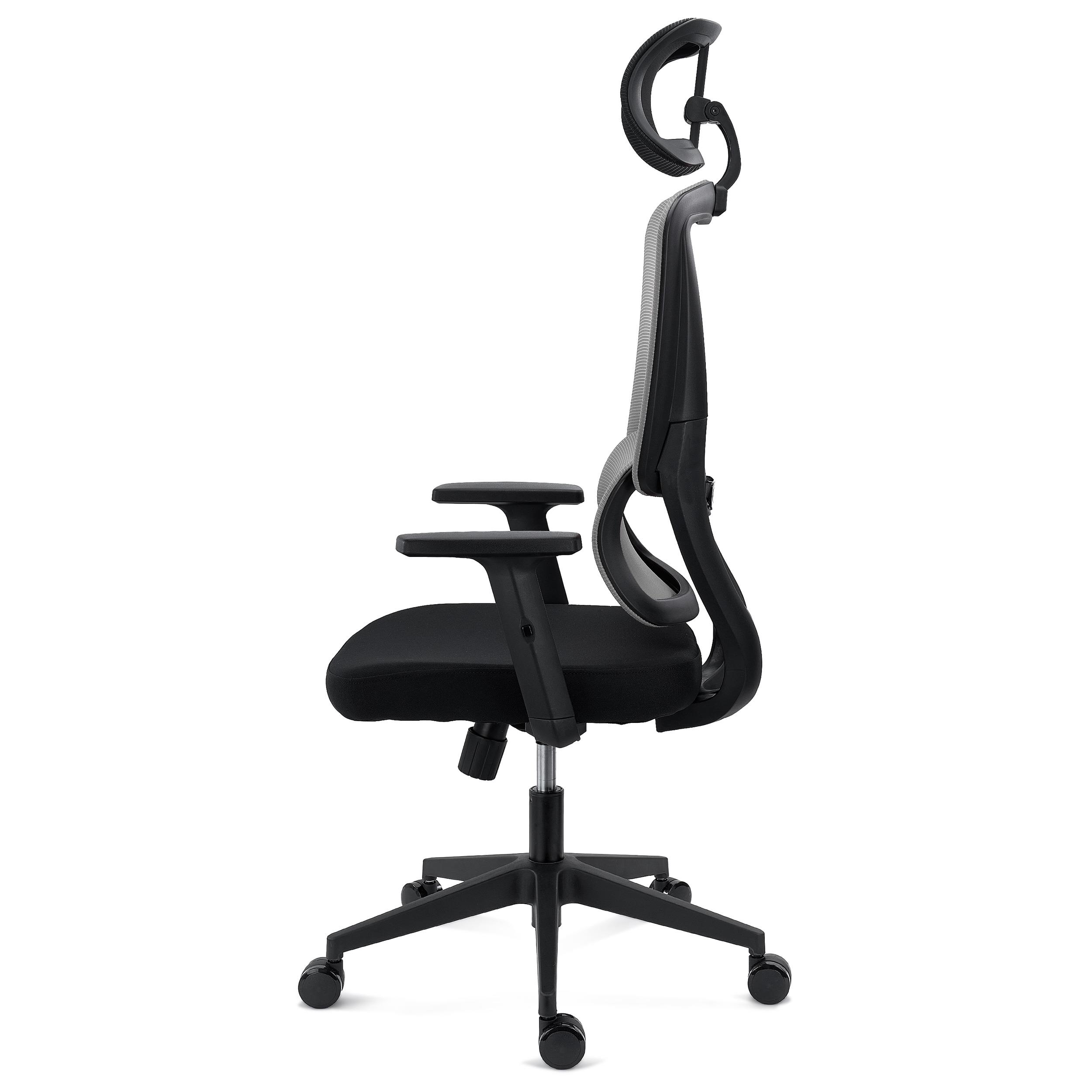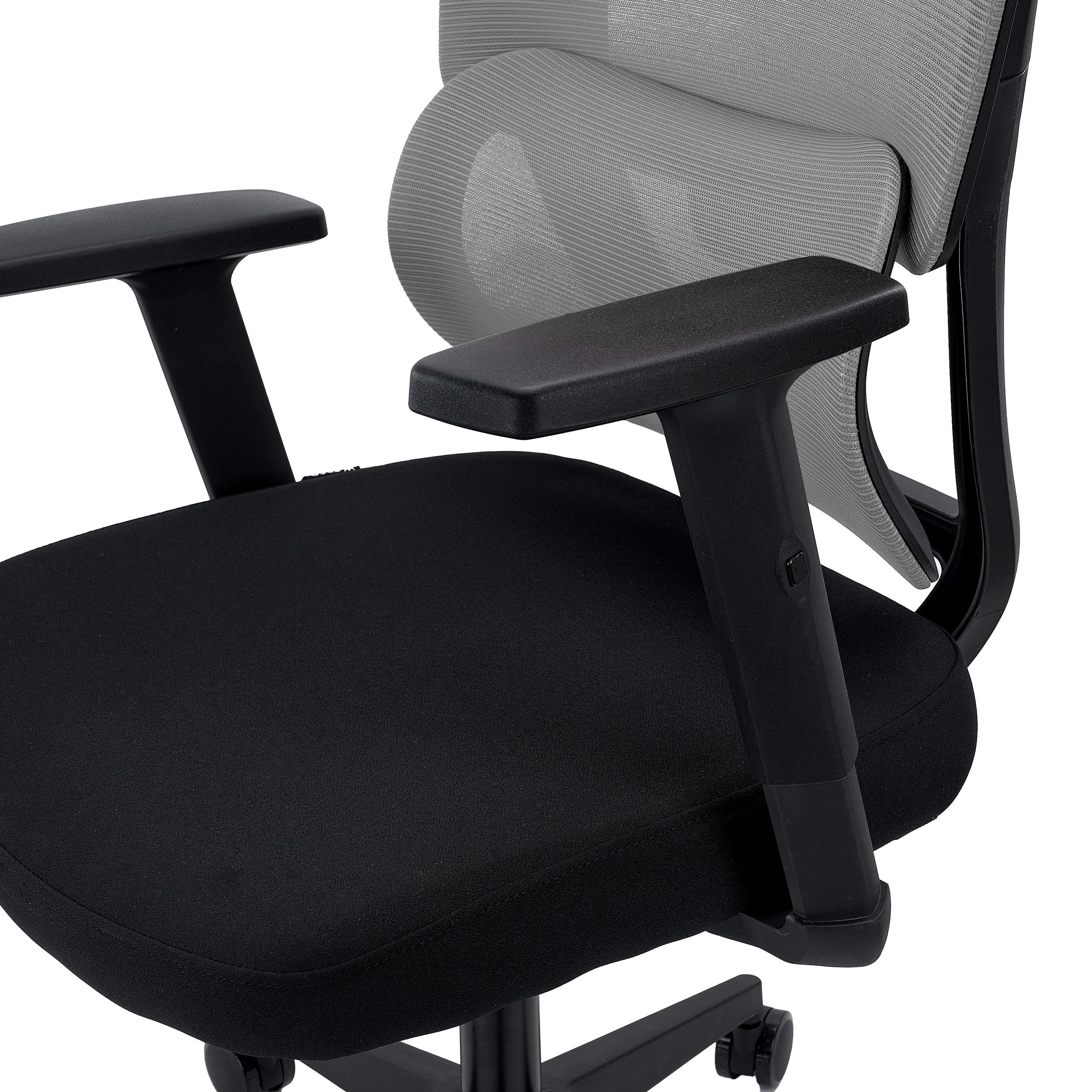 Los reposabrazos son ajustables en altura. Su robusta apariencia refuerza el concepto de silla duradera y para uso exigente. El reposacabezas es regulable tanto en altura (9 cm de ajuste) como en ángulo (hasta 45º), estando tapizado también en malla transpirable.