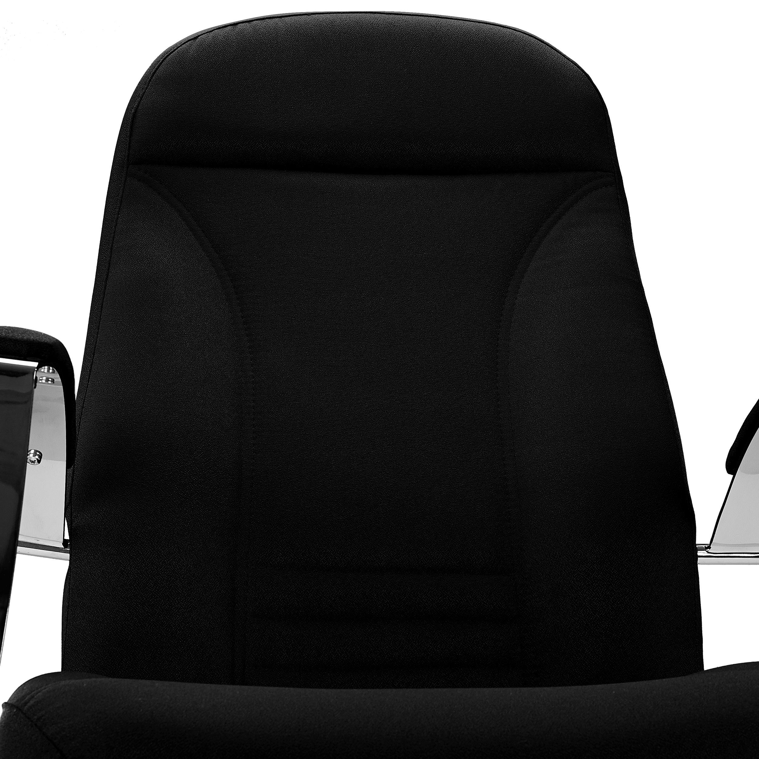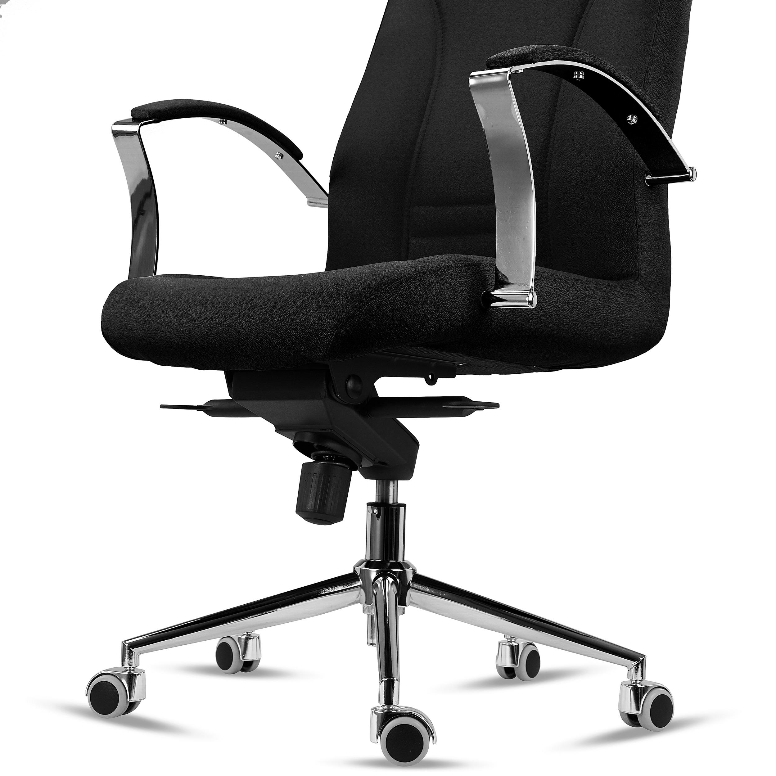 Los reposabrazos de diseño en acero cromado van tapizados en su parte superior para que además de tener una bonita apariencia, sean cómodos de usar. Su robusta base en acero cromado con forma piramidal ofrece gran resistencia, durabilidad y máxima estabilidad del usuario. El elegante acabado de este material se extiende incluso hasta las ruedas, aptas para todo tipo de suelos (con recubrimiento de goma).