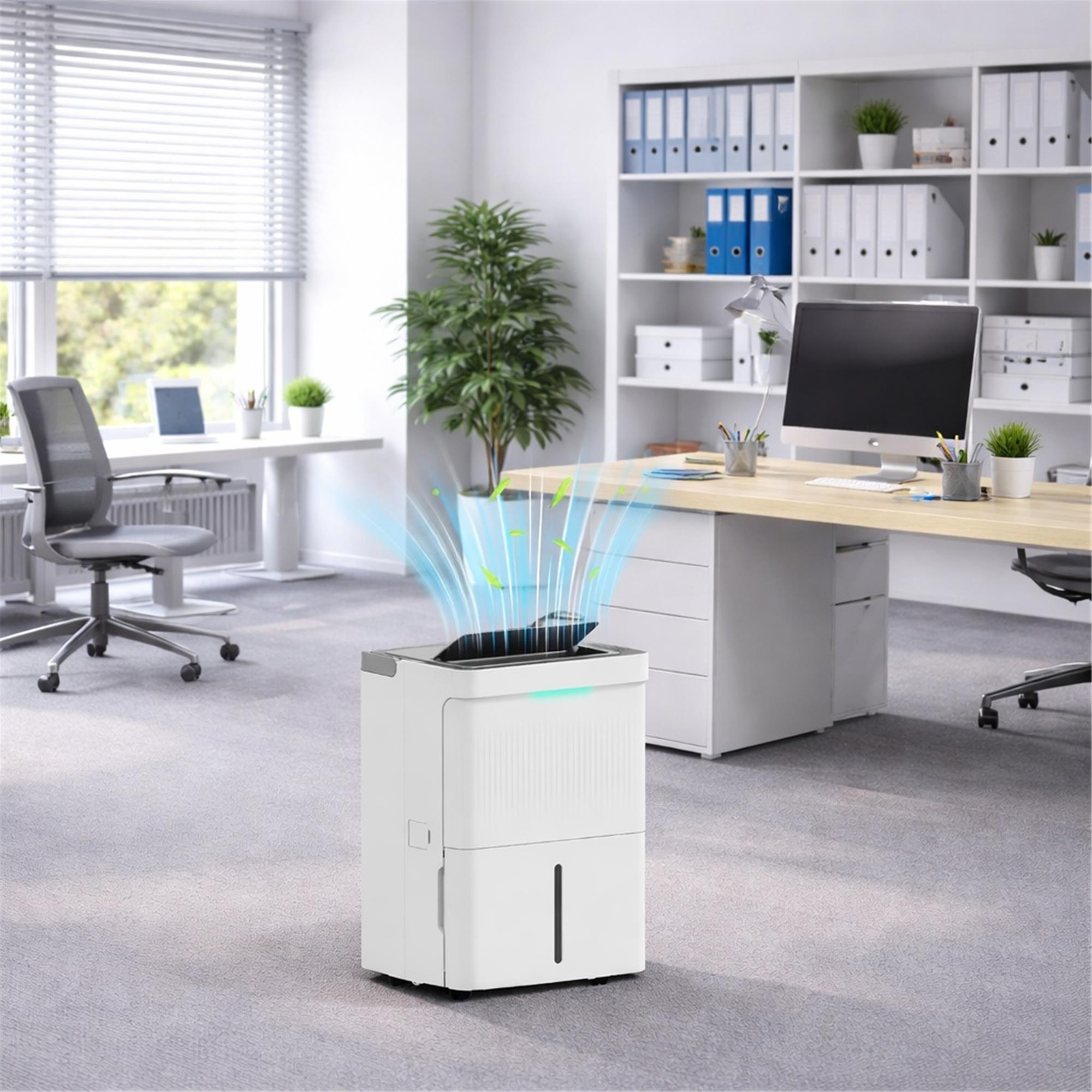 Deshumidificador para oficina OFFIDRY, un modelo diseñado para eliminar el exceso de humedad y prevenir la formación de condensación. Gracias a su diseño moderno y silencioso, se integra perfectamente en cualquier oficina sin perturbar la concentración, garantizando un aire siempre fresco y limpio. Es la solución ideal para proteger los dispositivos electrónicos y los documentos de archivo.