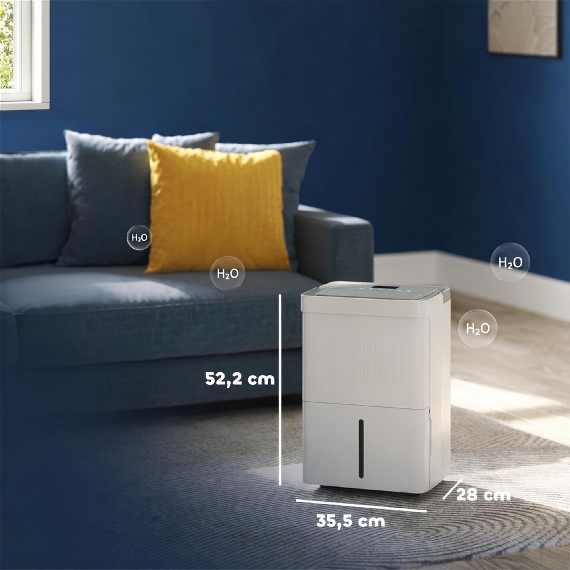 Este deshumidificador es adecuado para una superficie amplia de entre 40 y 100 m², cuenta con un depósito de 5,5 litros y elimina hasta 35 litros de agua al día. Está equipado con un filtro extraíble y, gracias a su funcionamiento, es capaz de mover hasta 250 m³/h de aire, garantizando una rápida reducción de la humedad en el ambiente.