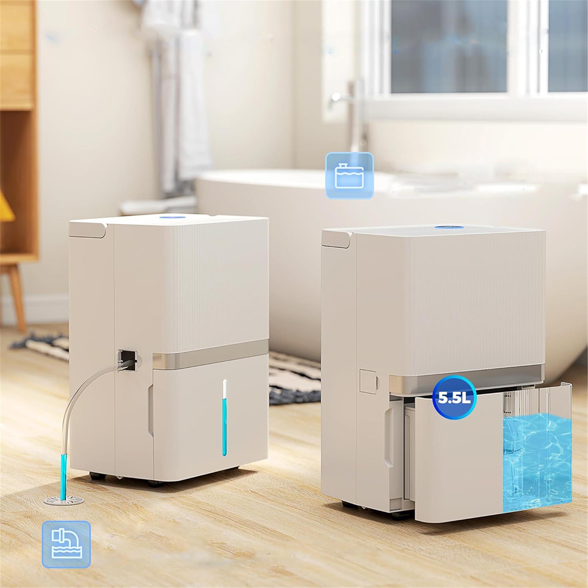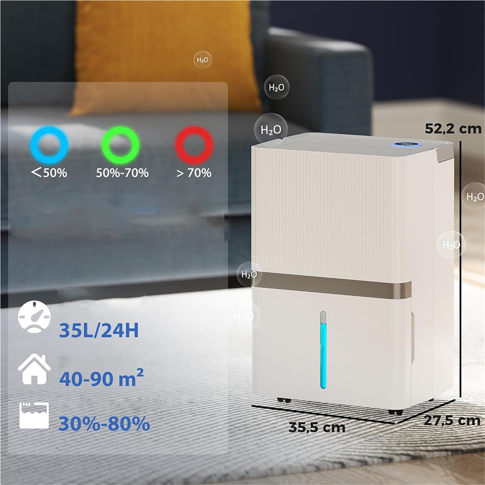Este deshumidificador es adecuado para una superficie amplia de entre 40 y 90 m², cuenta con un depósito de 5,5 litros y elimina hasta 35 litros de agua al día. Está equipado con un filtro extraíble y, gracias a su funcionamiento, es capaz de mover hasta 350 m³/h de aire, lo que garantiza una rápida reducción de la humedad en el ambiente.