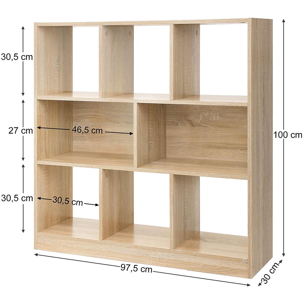 Estamos ante una solución de almacenaje muy funcional. Sus dimensiones son de 97,5x100x30 cm y dispone de 8 compartimentos abiertos para colocar libros, recuerdos u objetos decorativos.
