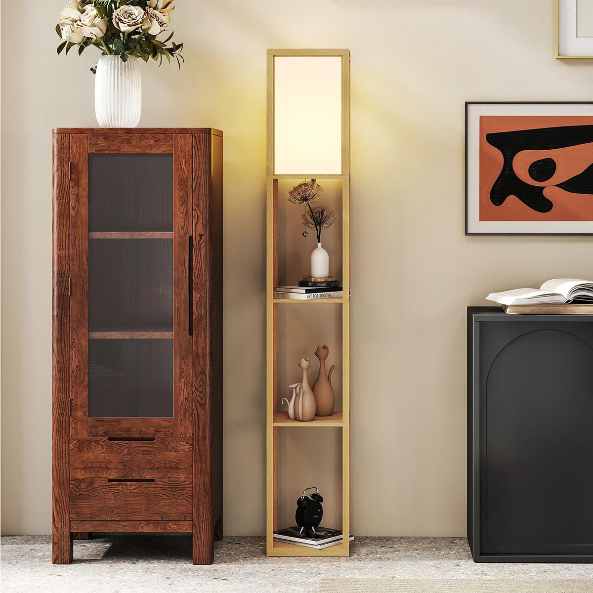 Dispone de 3 estantes integrados, perfectos para mantener pequeños objetos organizados y a la vista. Podrás colocar libros, marcos de fotos, plantas decorativas o cualquier accesorio que quieras tener a mano, optimizando el espacio sin renunciar al diseño. Además, su pantalla de 39 cm de altura suaviza la luz, creando un ambiente agradable y confortable que protege la vista y mejora la experiencia de iluminación.