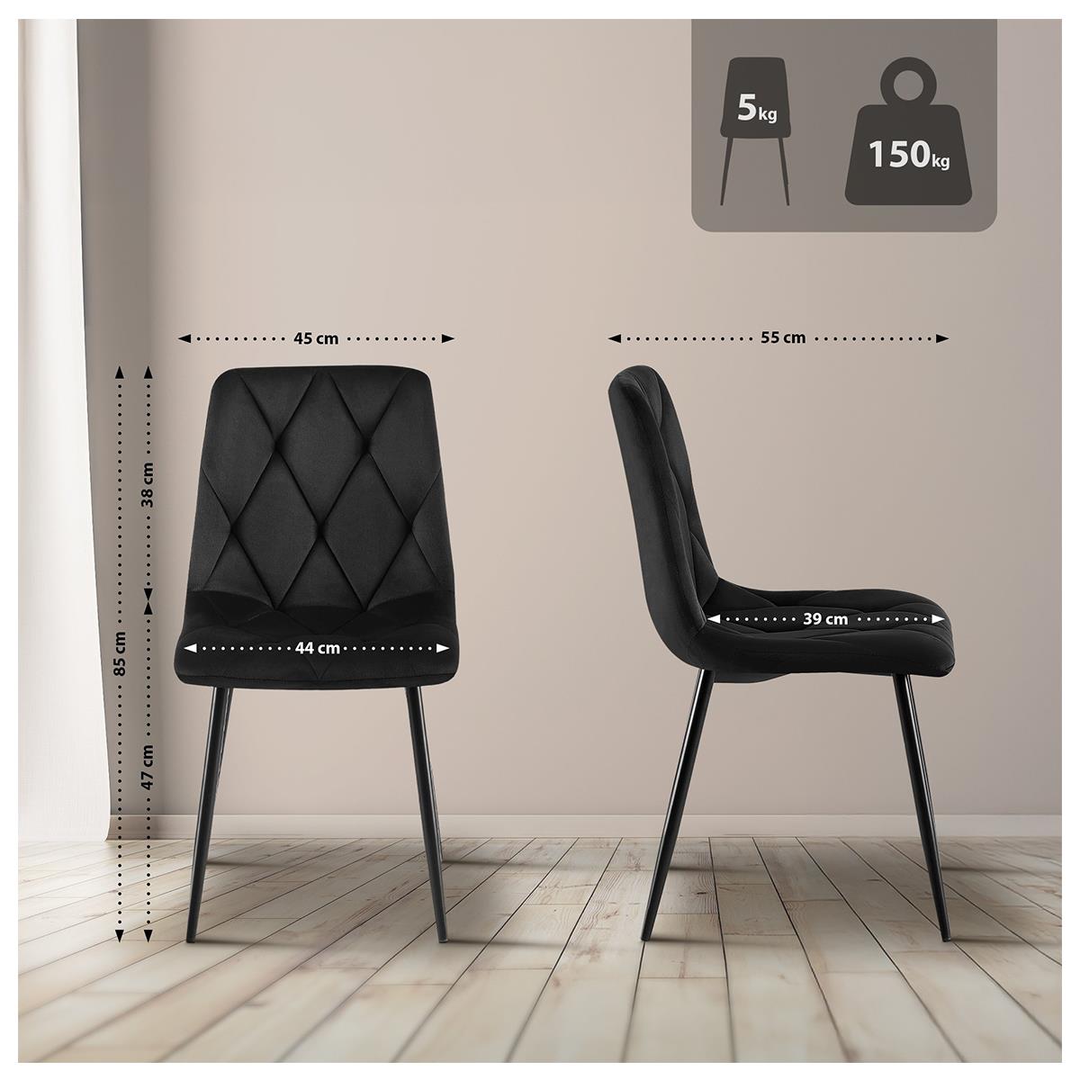 Estas sillas han sido fabricadas con materiales de alta calidad, lo que garantiza durabilidad y confort. El tapizado de terciopelo aporta un toque de lujo y una sensación muy agradable al sentarse. Las patas metálicas en color negro no solo ofrecen una base sólida y estable, sino que también crean un contraste elegante con el tejido. Además, son sillas muy resistentes, con una capacidad de carga de hasta 150 kg, y cuentan con protectores en las patas para cuidar las superficies más delicadas.