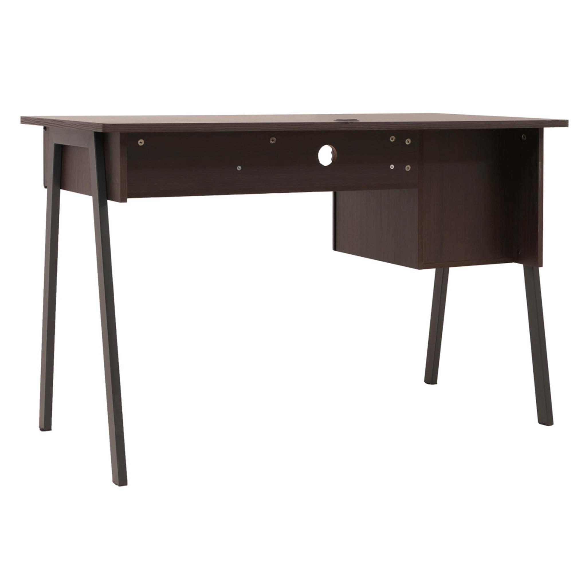 El escritorio cuenta con una amplia superficie de trabajo de 120 x 60 cm en madera MDF de eucalipto con orificio para cables, mientras que la estructura es de acero macizo. Las robustas patas metálicas garantizan la estabilidad y están equipadas con protectores para el suelo que evitan rayaduras o roces innecesarios en la superficie donde lo coloques.