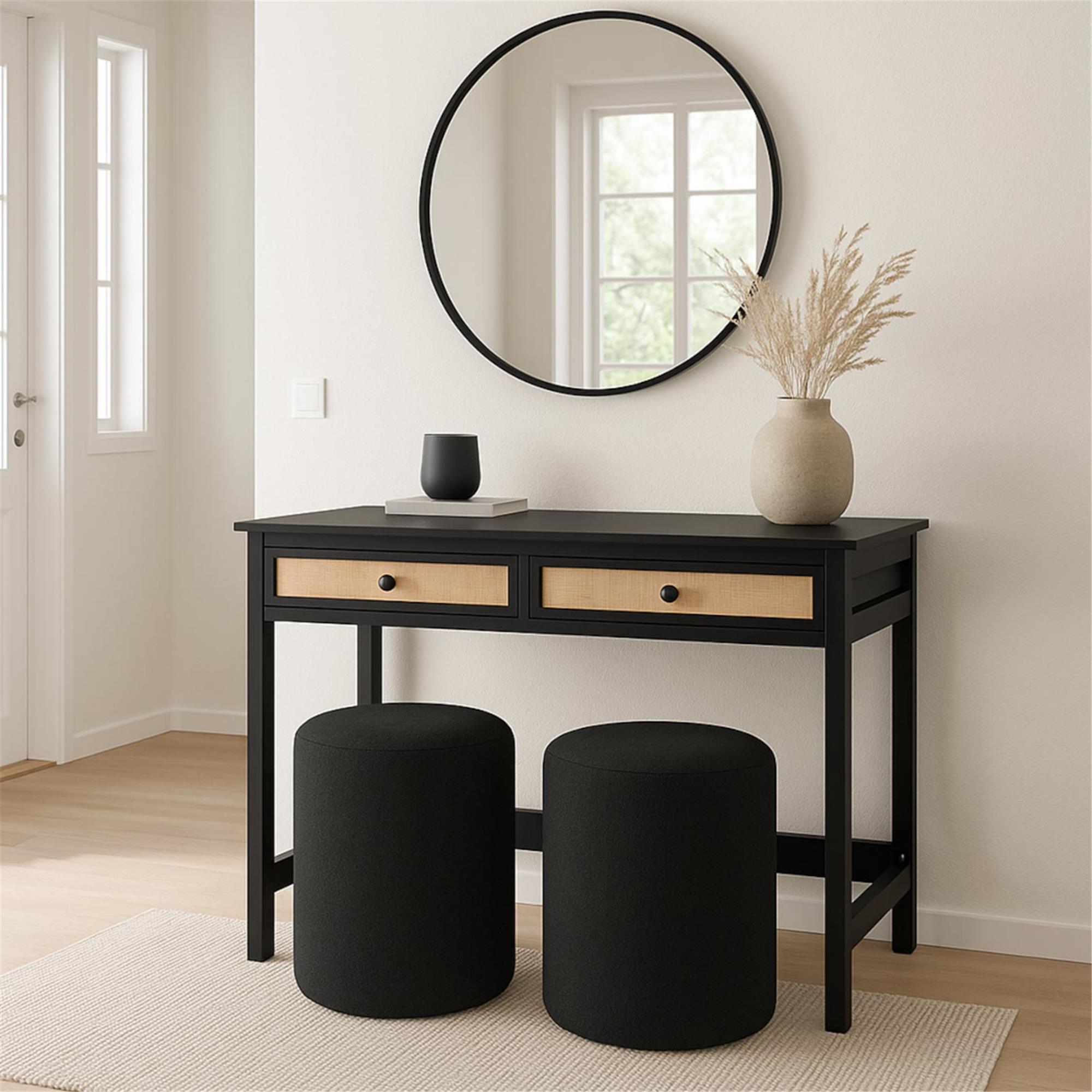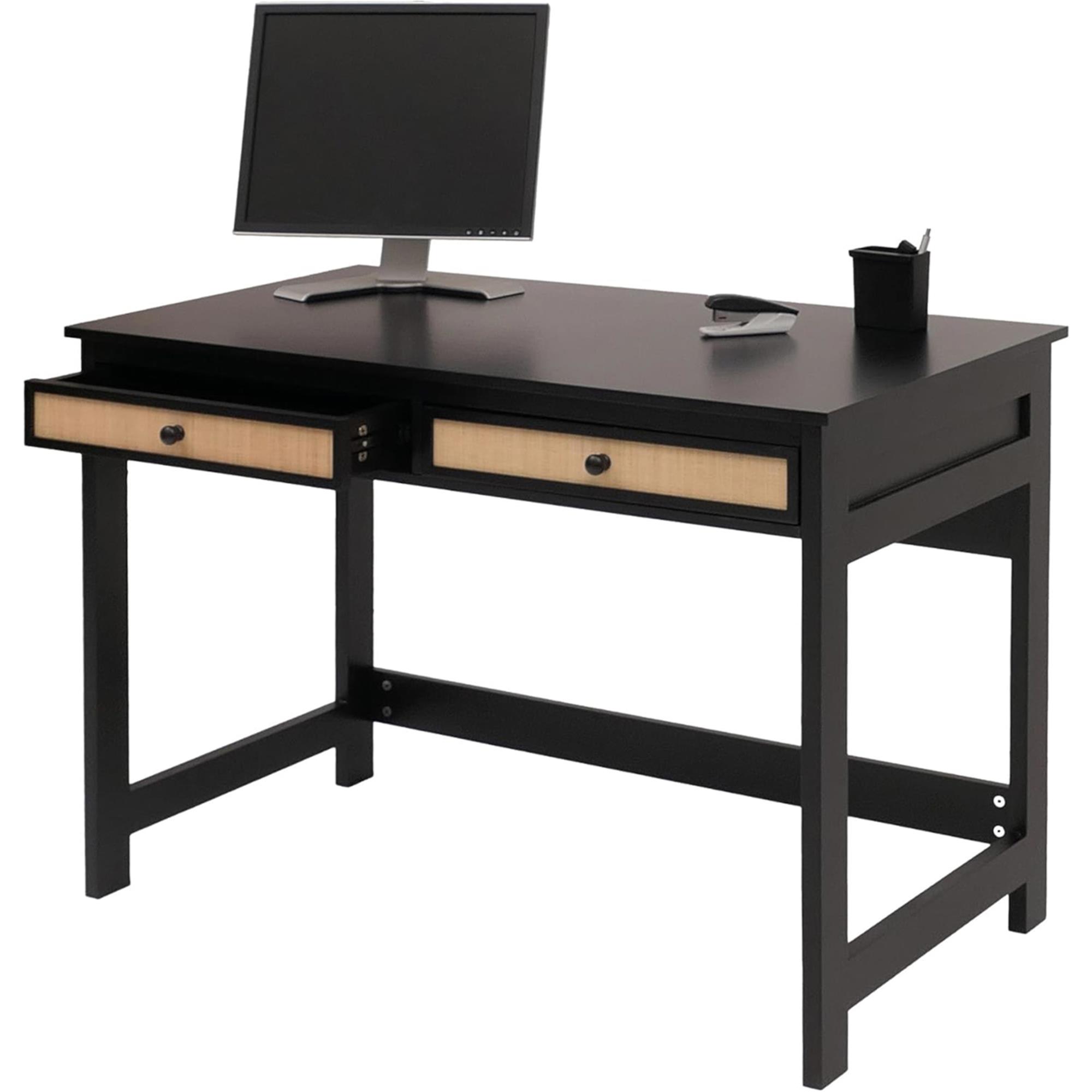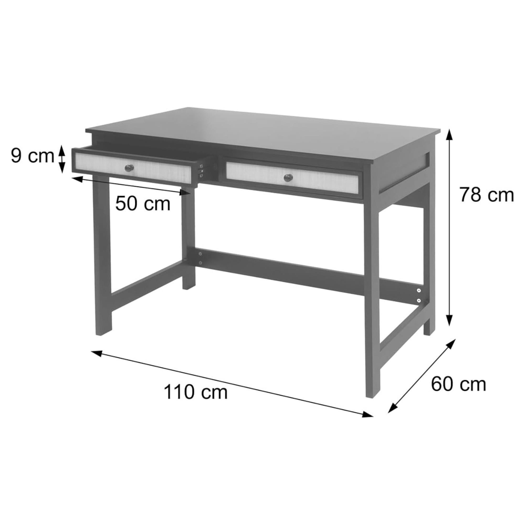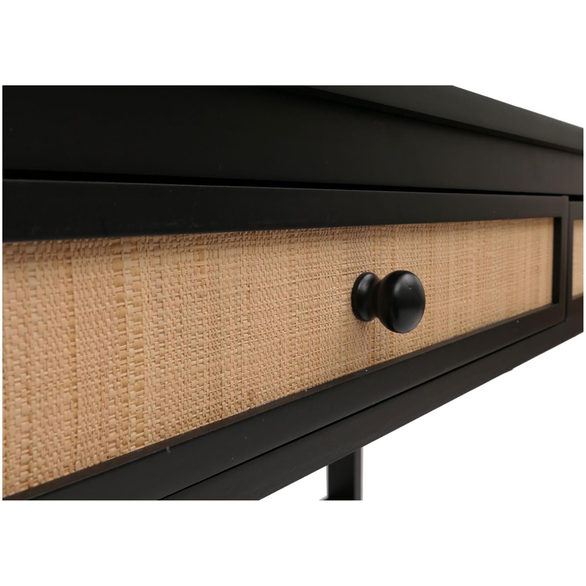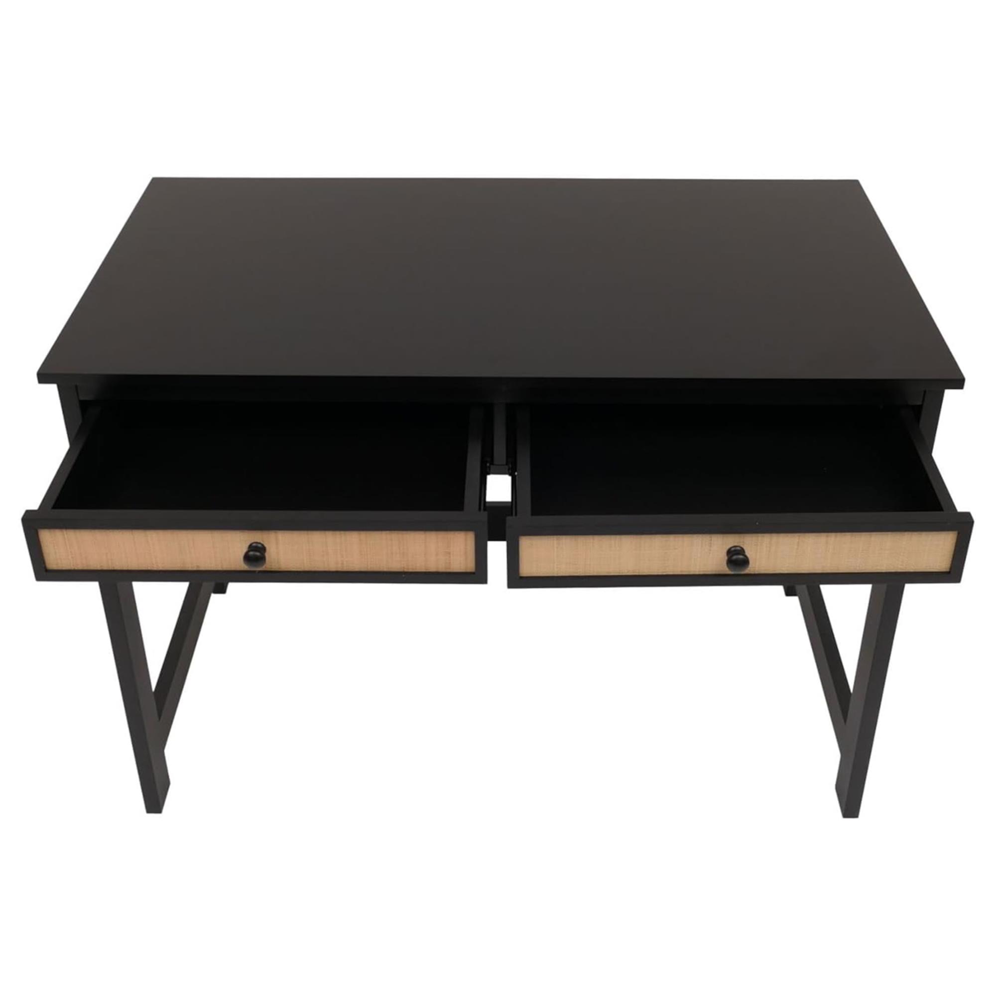 El escritorio está equipado con dos cómodos cajones con guías deslizantes que proporcionan espacio para guardar documentos u objetos que no se desean tener a la vista. Las dimensiones exteriores de los cajones son 9x50x37 cm (alto x ancho x profundidad); mientras que las interiores son de 6x44x33 cm. Un elemento destacado son los frentes de los cajones de rafia, que le dan a la mesa un toque natural y cálido.