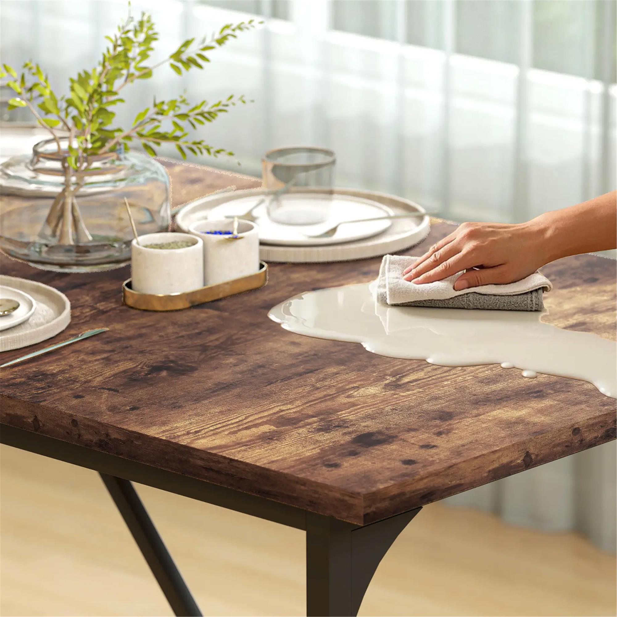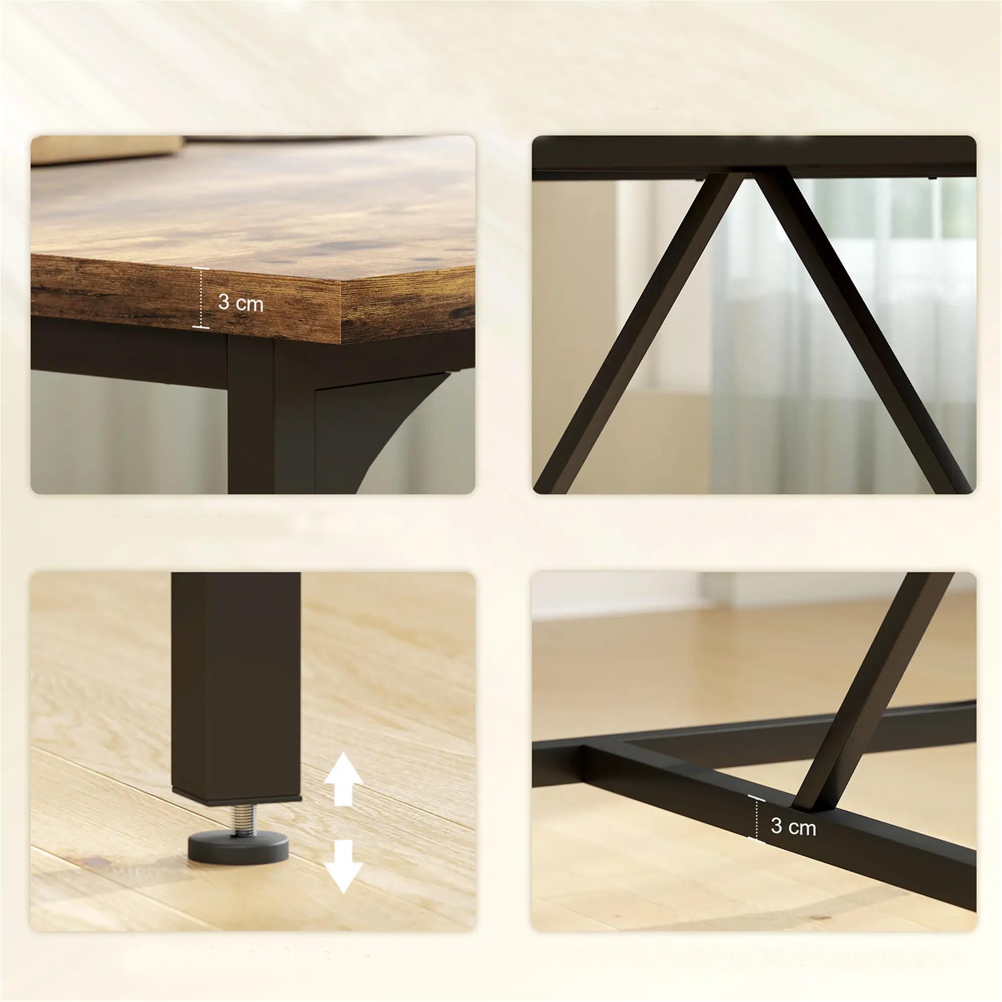 El tablero, fabricado en madera con acabado envejecido y vetas naturales, de 3 cm de grosor, aporta calidez al ambiente creando un estilo rústico perfecto. Gracias a sus generosas dimensiones, ofrece un amplio espacio para ordenadores portátiles, documentos y accesorios de trabajo, lo que favorece la colaboración y la productividad durante las reuniones y las sesiones de brainstorming.