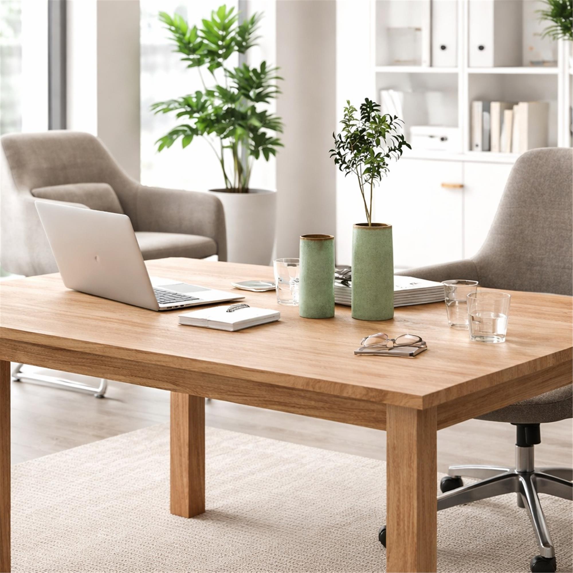 La mesa para sala de reuniones DILI destaca por su amplitud y funcionalidad, convirtiéndose en mucho más que un simple mueble: es una solución de diseño pensada para espacios de trabajo modernos que buscan equilibrio entre estilo y practicidad. Su acabado en madera clara aporta una sensación cálida y natural, integrándose con facilidad en cualquier oficina o sala de reuniones.