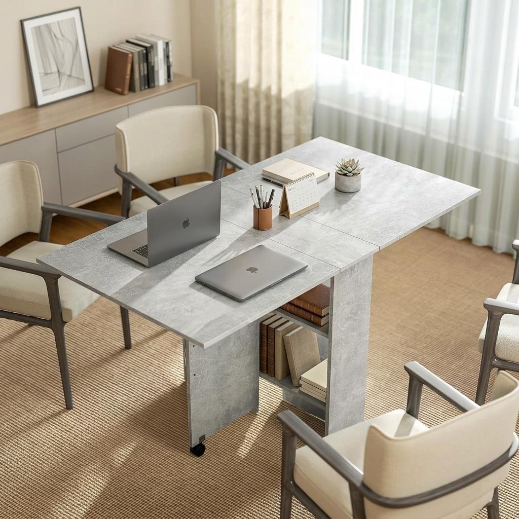 Cuenta con un práctico sistema de doble ala abatible, que ofrece una flexibilidad total según el número de personas o la tarea a realizar. Gracias a sus dos alas laterales independientes, la mesa puede pasar de ser una estrecha consola de tan solo 23 cm de fondo a una superficie generosa de 140 cm con capacidad para hasta 6 personas. Esta versatilidad permite utilizarla en tres posiciones: totalmente cerrada como mueble auxiliar, con un ala abierta para un uso individual o compartido, o completamente extendida para reuniones de equipo.