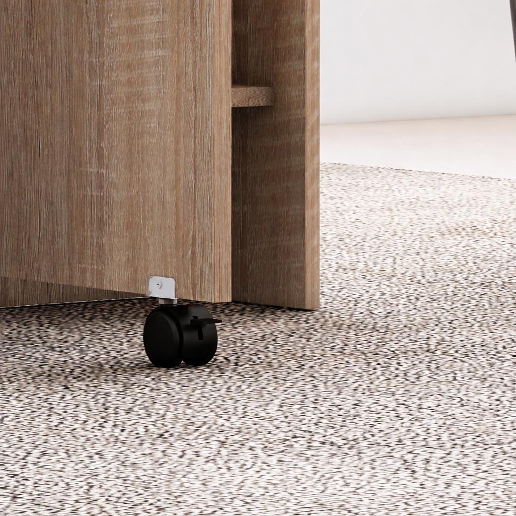Más allá de su capacidad de plegado, este modelo destaca por su funcionalidad añadida, ya que incorpora dos estantes centrales que proporcionan un valioso espacio de almacenaje. Además, para facilitar su manejo y garantizar la estabilidad, la mesa cuenta con dos ruedas con freno que permiten desplazarla sin esfuerzo y fijarla de forma segura una vez colocada en su posición. La estructura, fabricada en madera de alta calidad, garantiza una superficie robusta y resistente al uso diario, manteniendo un perfil ligero y moderno.
