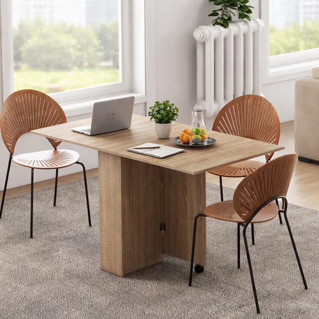 Cuenta con un práctico sistema de doble ala abatible, que ofrece una flexibilidad total según el número de personas o la tarea a realizar. Gracias a sus dos alas laterales independientes, la mesa puede pasar de ser una estrecha consola de tan solo 23 cm de fondo a una superficie generosa de 140 cm con capacidad para hasta 6 personas. Esta versatilidad permite utilizarla en tres posiciones: totalmente cerrada como mueble auxiliar, con un ala abierta para un uso individual o compartido, o completamente extendida para reuniones de equipo.