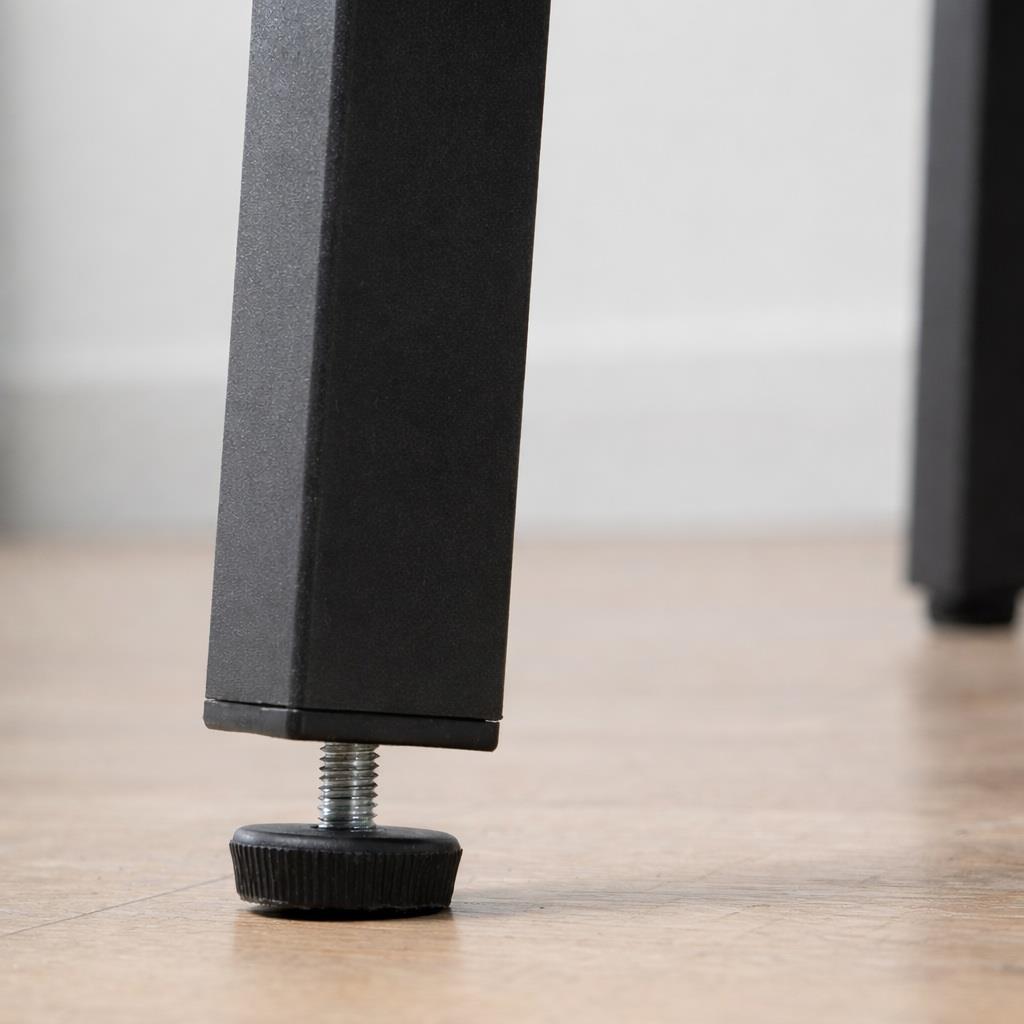 La robustez de este modelo reside en su estructura de patas de acero que incorporan un refuerzo en cruz estratégicamente situado para garantizar una estabilidad superior. Pensando en la protección de los entornos de oficina, las patas están equipadas con almohadillas antideslizantes que evitan desplazamientos accidentales y protegen el suelo de posibles rayaduras. Con una capacidad de carga de hasta 60 kg, esta mesa se consolida como una opción sólida, fiable y de gran impacto visual para cualquier entorno corporativo.