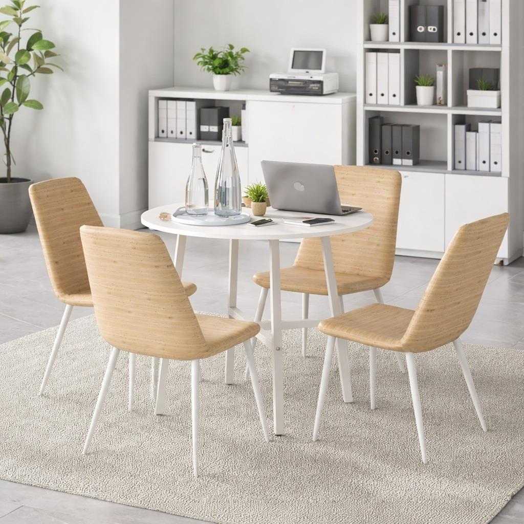 Esta mesa cuenta con una superficie circular de 80 cm de diámetro, un tamaño optimizado para facilitar la interacción de hasta 4 personas. Al carecer de esquinas, este formato no solo aprovecha mejor el espacio disponible en salas de dimensiones reducidas, sino que también elimina las barreras visuales y promueve una comunicación más dinámica y cercana entre los participantes. El tablero de madera melaminada ofrece una estética acogedora que es, al mismo tiempo, muy fácil de limpiar y mantener impecable tras cada jornada de trabajo.