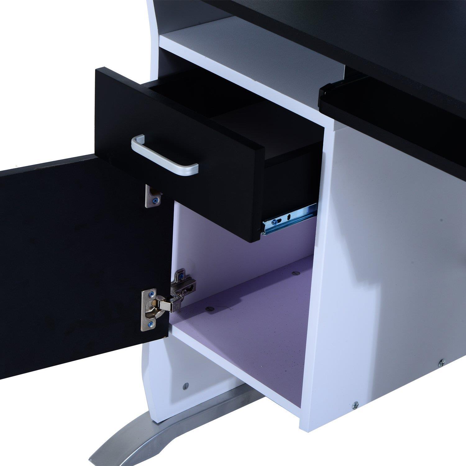 También dispone de amplios espacios para almacenaje para poder organizar nuestros objetos necesarios para el día a día, consiguiendo así mantener el orden en nuestro espacio de trabajo. Tiene un cajón con raíles metálicos y un armario con resistentes bisagras también en metal.