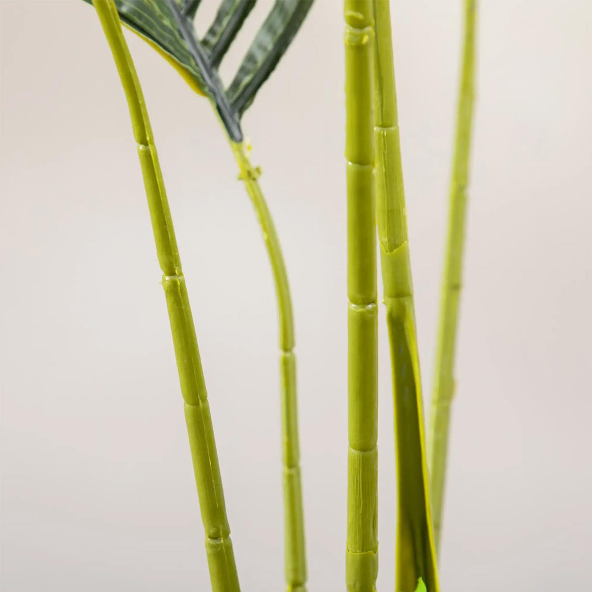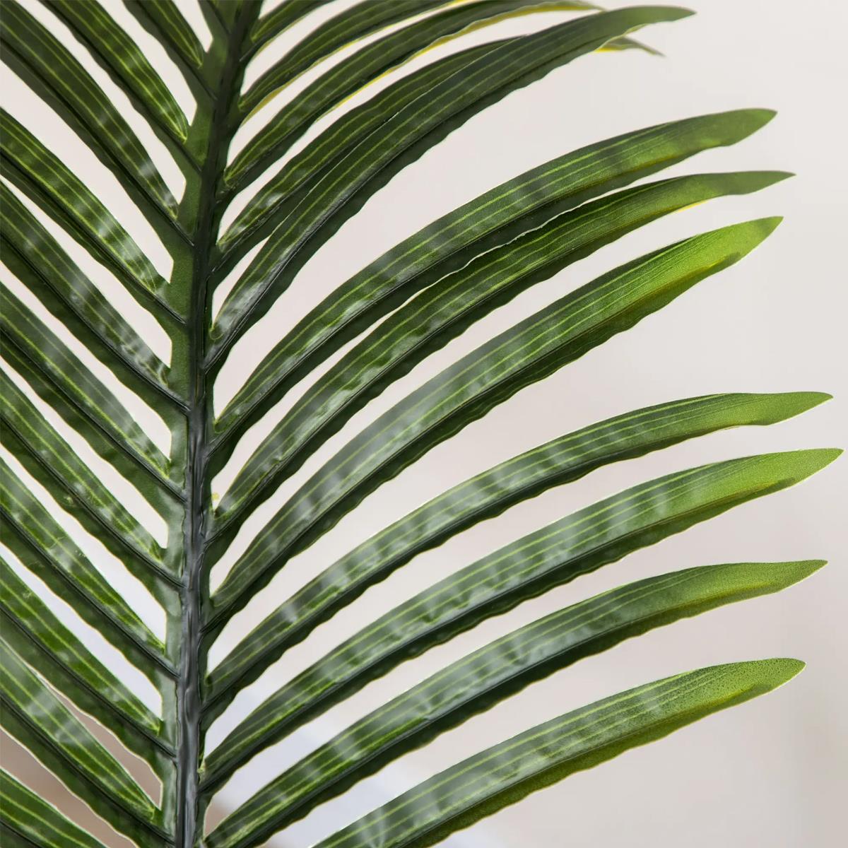 Con una altura total de 170 cm, esta palmera tipo areca destaca por su porte estilizado y sus hojas alargadas y arqueadas que crean una silueta ligera, natural y muy decorativa. Sus 11 hojas frondosas, con distintos matices de verde y una textura cuidadosamente trabajada, reproducen con gran fidelidad el aspecto de una palmera natural.