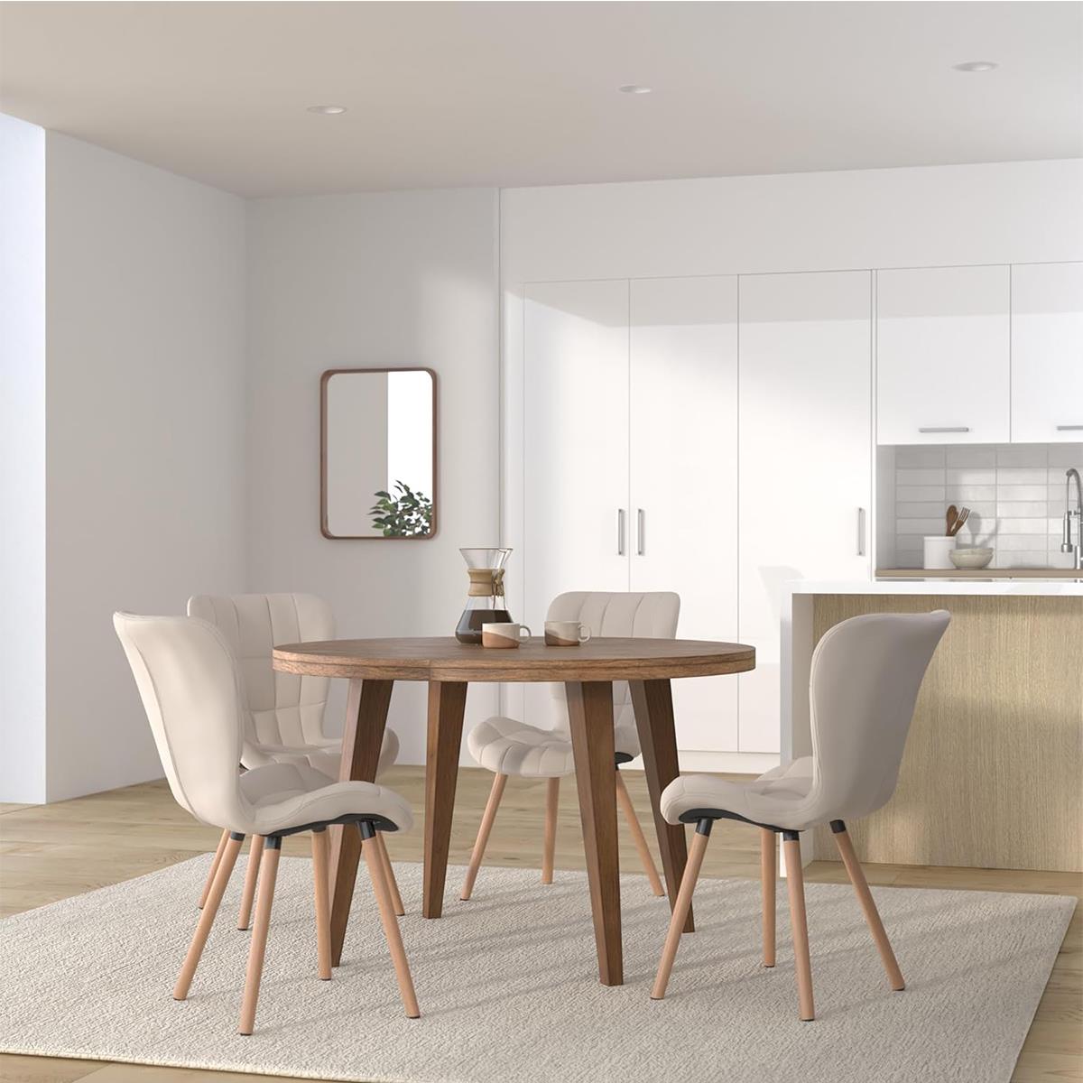 Está fabricada con materiales de gran calidad, por lo que durará muchos años en perfectas condiciones. Las patas de madera son muy robustas y resistentes. Además, aportan un toque de diseño muy atractivo y  original. Por otro lado, las sillas están tapizadas en piel de gran calidad de tacto muy agradable que se puede limpiar fácil y cómodamente.