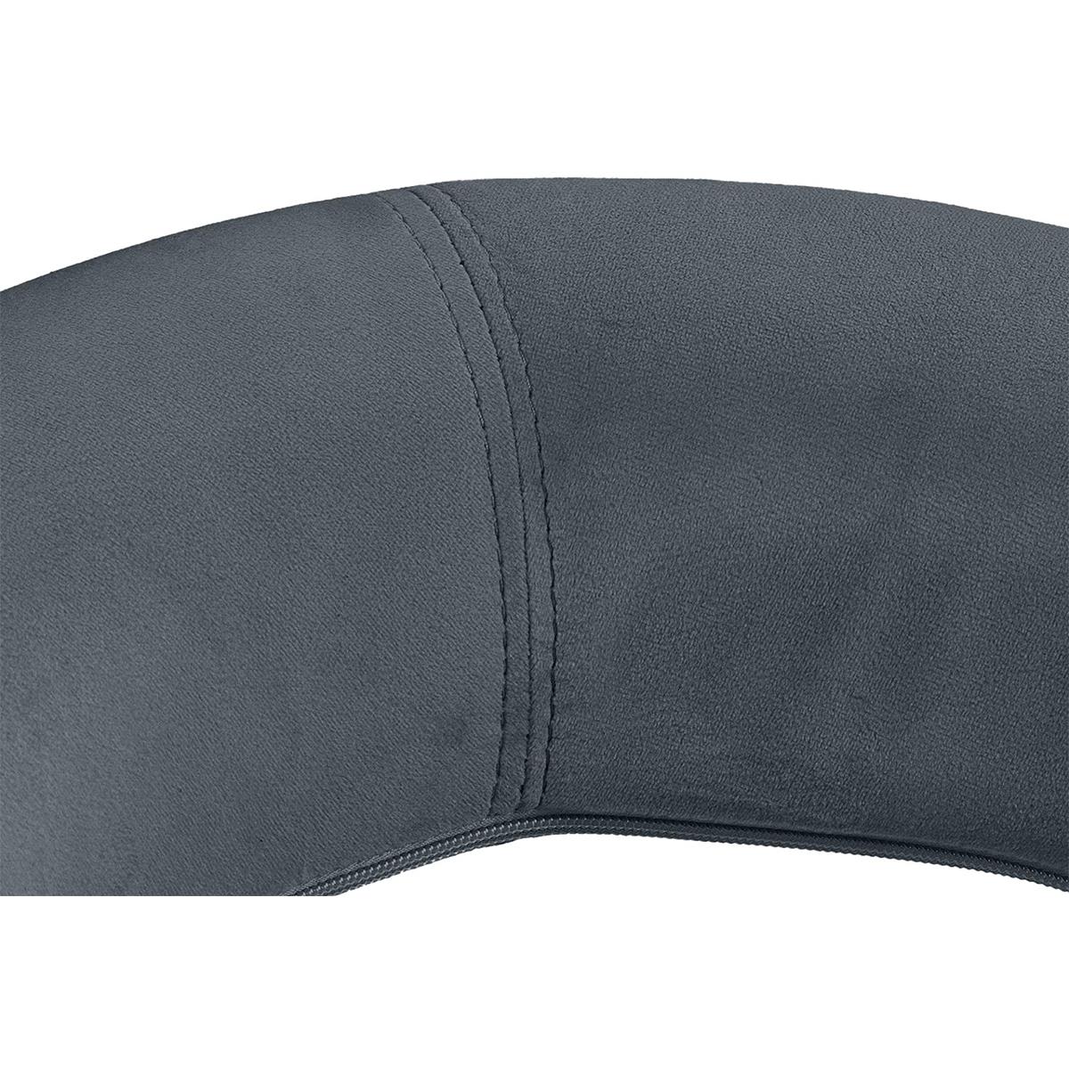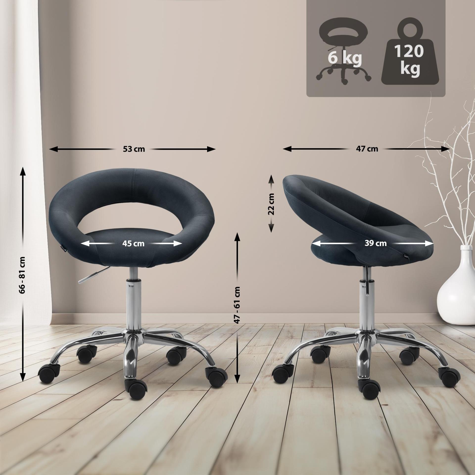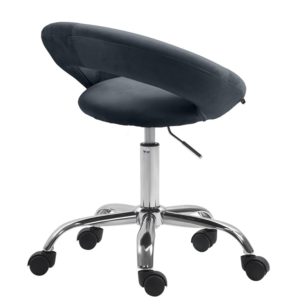 Es un producto diseñado con atención al detalle y fabricado con materiales de calidad. El asiento es giratorio 360° y está generosamente acolchado. Esta silla ha sido tapizada en terciopelo suave y de fácil cuidado, lo que le aporta elegancia y gran confort a su uso. El respaldo está diseñado para sujetar la zona lumbar, lo que permite trabajar en el taburete durante largos periodos, incluso a diario, sin comprometer la postura.