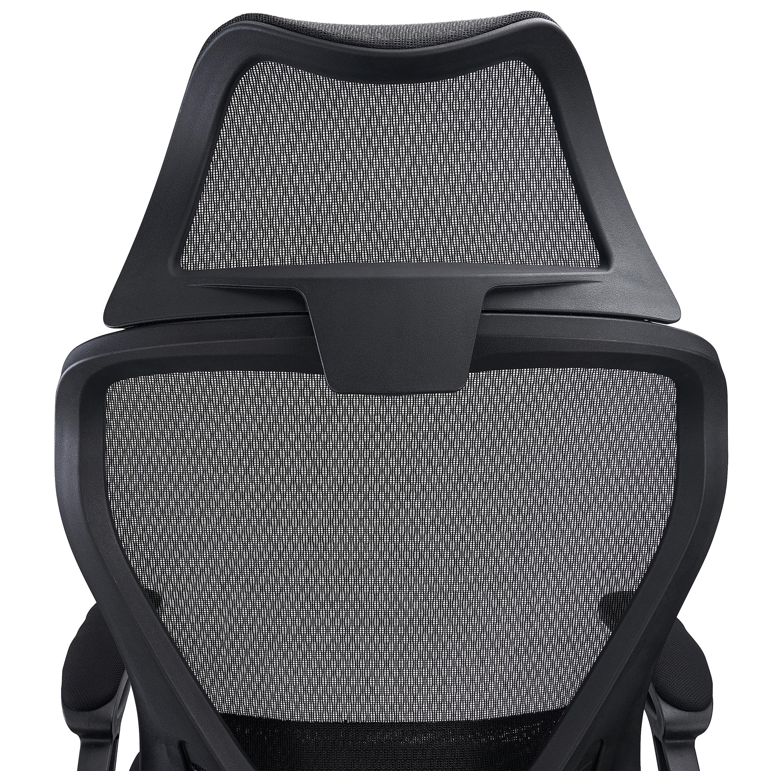 Lo más destacable de su respaldo es el soporte lumbar integrado. Gracias a la malla transpirable y su flexibilidad la silla se adapta totalmente a tu espalda. En este caso estamos ante la versión con reposacabezas, integrado con el diseño del respaldo, actuando incluso como prolongación del mismo.