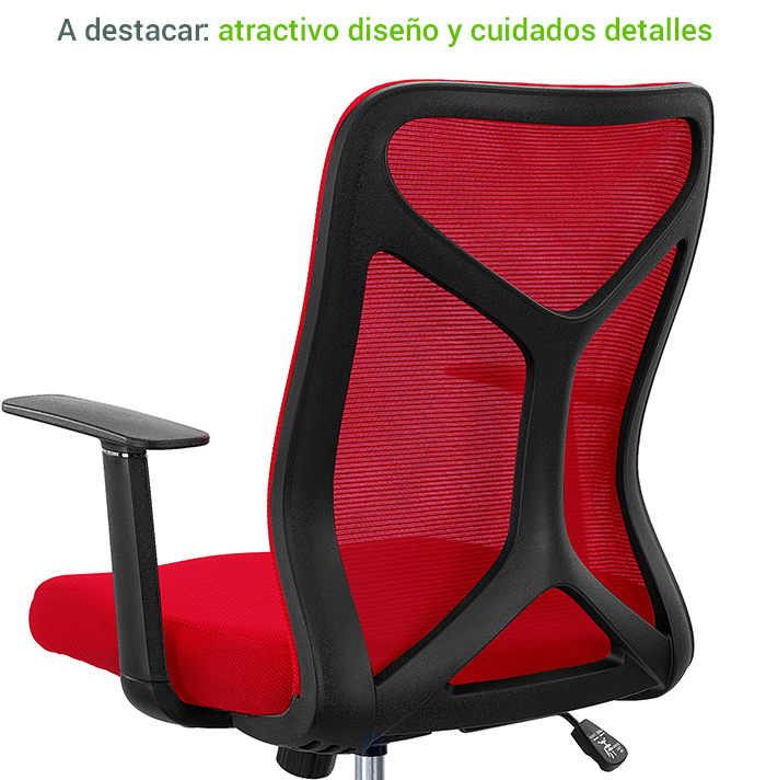 El respaldo está tapizado en malla transpirable. En su vista lateral se puede apreciar su forma ergonómica, siguiendo la curvatura de la espalda, lo que permite un óptimo apoyo de la misma. La malla es un material muy cómodo, asegurando una buena ventilación de la espalda, especialmente en los meses más calurosos. Además, es muy resistente y se limpia fácilmente con un simple paño humedecido.