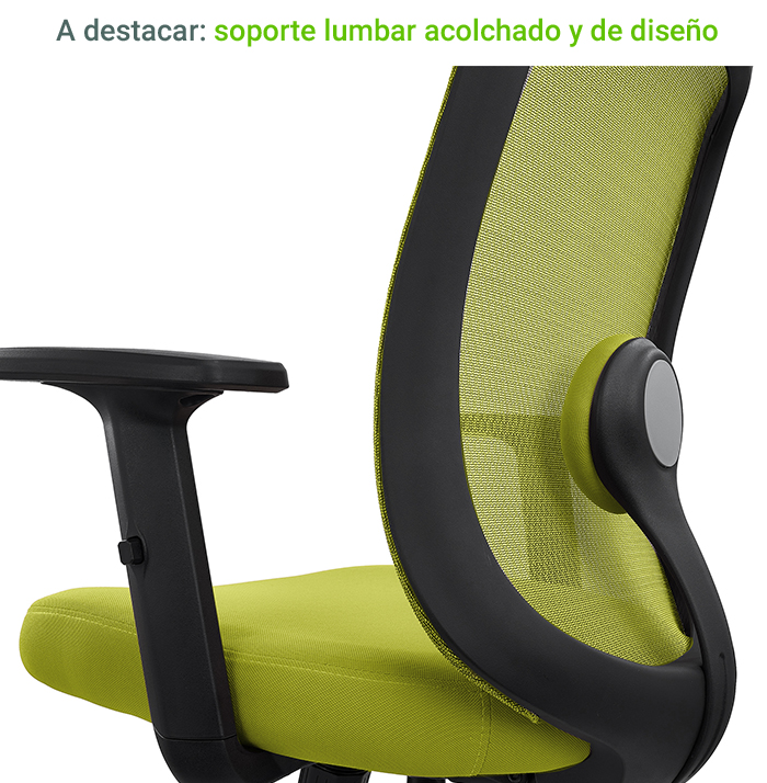 El original diseño del soporte lumbar del respaldo es su seña de identidad. Es acolchado y muy agradable, gracias a su forma circular ofrece sujeción para la parte baja de la espalda, pero a su vez con el equilibrio perfecto entre firmeza y suavidad. El tapizado en malla transpirable del respaldo es muy cómodo, resistente y de fácil limpieza.