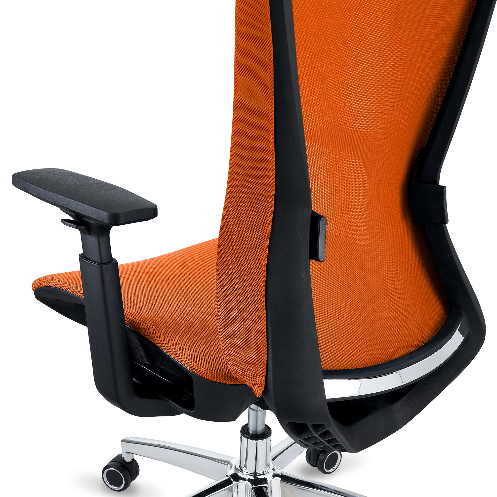 Empezando por el respaldo, destaca su estudiada forma ergonómica. Por un lado, podemos apreciar el gran trabajo realizado para cuidar al máximo la espalda, gracias a la curvatura que tiene. Por el otro, su estructura presenta una línea muy sofisticada, atractiva y especial. Fíjate en el detalle cromado en la parte trasera y en la solidez que transmite. El tapizado en malla transpirable y refuerzo lumbar hacen que la experiencia de uso sea de otro nivel.