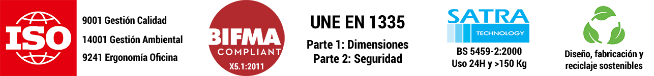 Todas las características de ergonomía, durabilidad, seguridad y clasificación de uso 24 horas/ 7 días a la semana quedan avaladas por los múltiples certificados de esta silla: UNE EN 1335, ANSI/BIFMA X5.1, SATRA BS 5459-2:2000 + A2:2008, UNE-EN ISO 9001, 14001, 14006, 9241-5, etc. Estas certificaciones también hacen referencia a la huella ambiental y reciclabilidad.