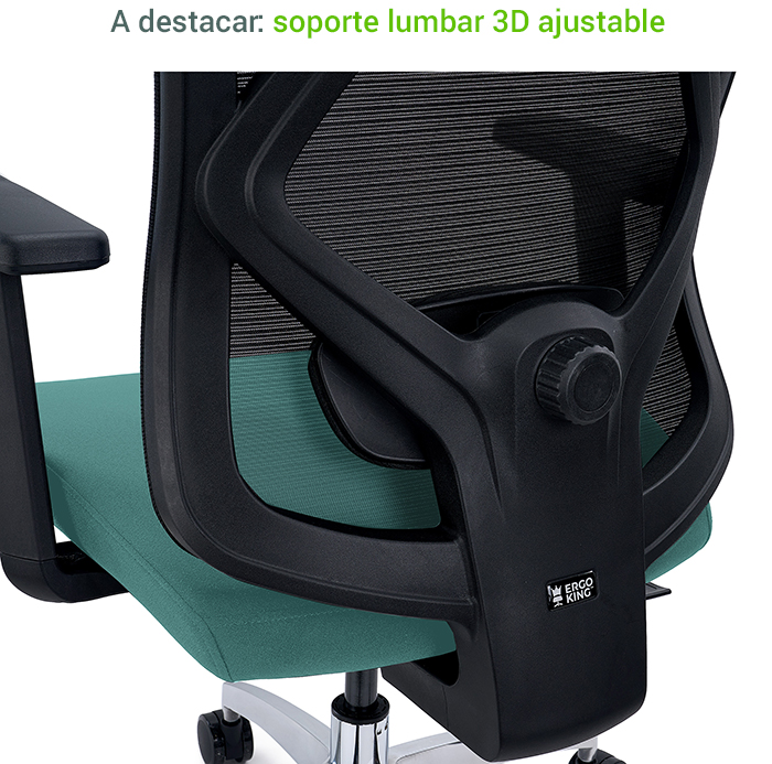Su respaldo es ergonómico, tapizado en malla 100% transpirable con un elegante patrón de líneas horizontales. El soporte lumbar que incluye es exclusivo, ya que es ajustable en profundidad, ángulo y altura. Estos ajustes permiten un óptimo refuerzo de la espalda baja, lo que se traduce en mayor confort. imprescindible en largas jornadas de trabajo.