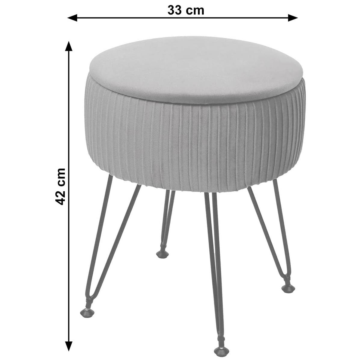 Está fabricado con materiales de calidad, como madera de paulownia MDF y patas metálicas, este taburete cuenta además con certificación BSCI, lo que garantiza una producción responsable y sostenible. Su tapizado de tejido aterciopelado (90 % poliéster y 10 % algodón, 220 g/m²) aporta una textura suave y agradable al tacto, mientras que las costuras decorativas realzan su acabado elegante y detallista. Gracias a sus patas ajustables en altura, el puf puede adaptarse fácilmente a suelos irregulares, asegurando siempre una posición estable.